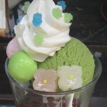 コーヒー、ジュース、うどん、そば、デザートなどの軽食のみの取扱になりますが、人気は抹茶色のアイスが乗った「アジサイパフェ」