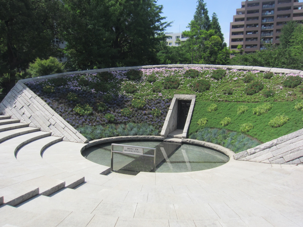 横網町公園の東京都慰霊堂の脇にある大きな祈念碑は東京空襲の史実を風化させることなく、今日の平和と繁栄が尊い犠牲の上に築かれていることを次世代に語り継ぎ、平和が永続することを祈念して建てられ、内部には東京空襲犠牲者名簿が納められているそうです。上部の花壇は都内の小中高校生から応募されたデザインを基に季節ごとに制作されています。