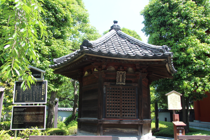 浅草寺の本堂の西北影向堂の先にある六角形のお堂です。浅草寺境内は朱色の建物が多いのですが、こちらは都内最古の木造建造物でいかにも年季が入った感じがします。