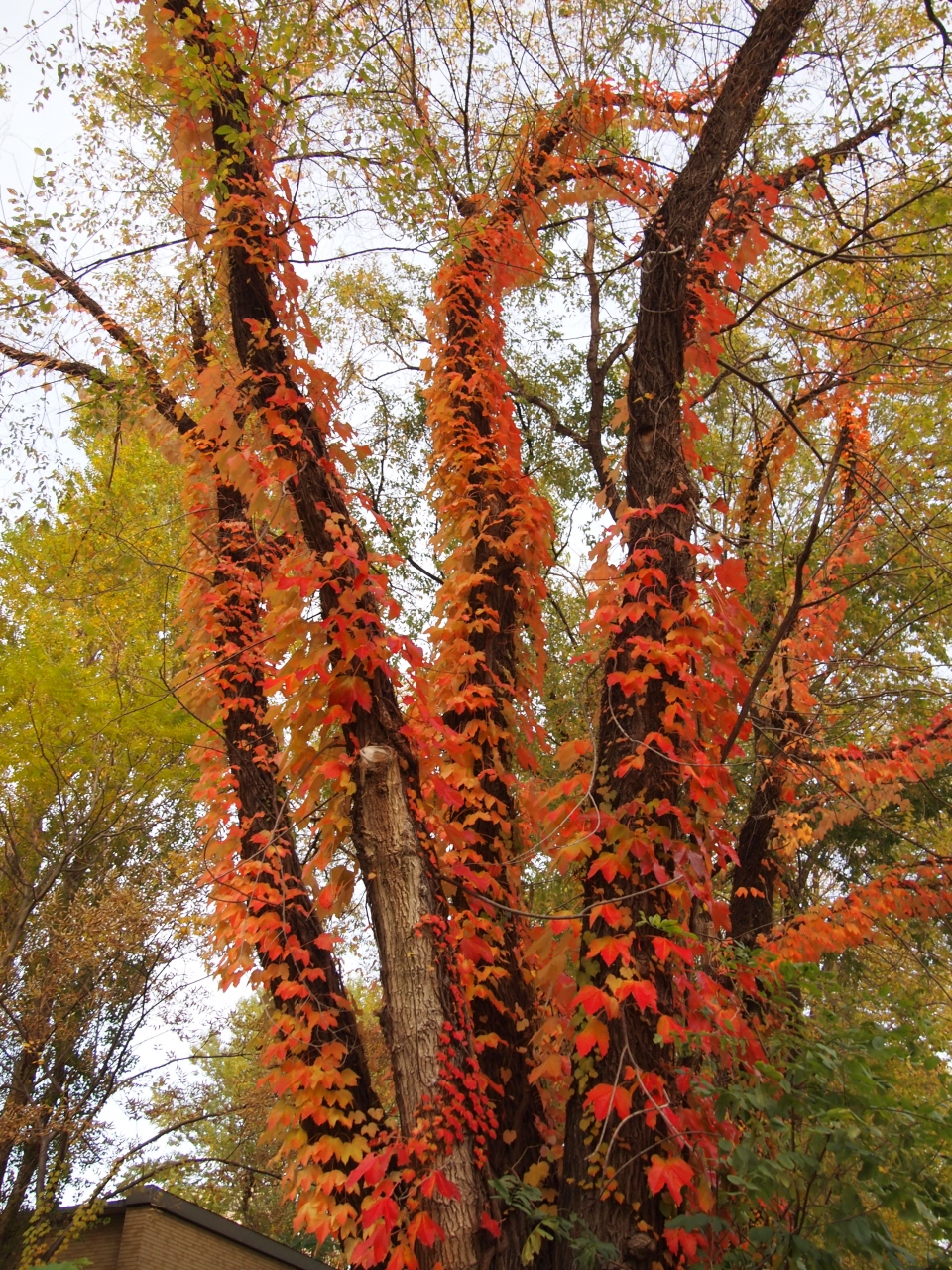 まず、メインストリート沿いの池のほとりの、木が燃えるような紅色になります。