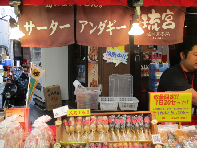 サーターアンダーギーを小さな団子状に作り、串でさしてあるのが珍しい。中で食べると冷たいお茶がサービスです。いろんな味の種類があるので迷いましたが、ゴマをチョイス。美味しいけど、個人的には三矢本舗の方が美味しいと思います。しゃれたパッケージがあるので、お土産にはよいです。