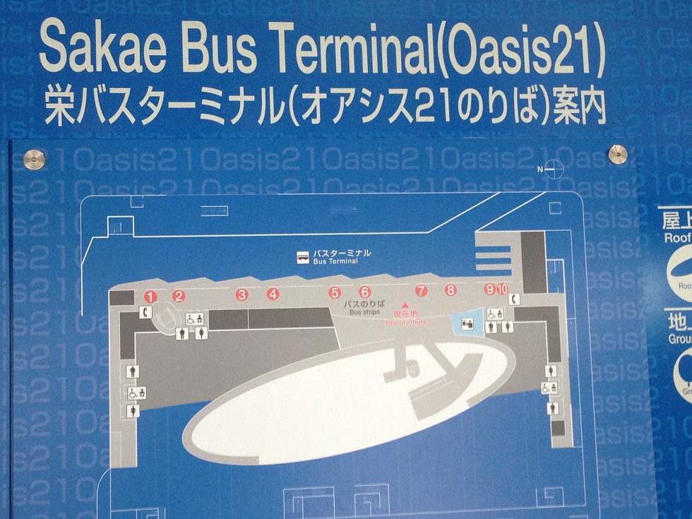 名古屋商業エリアにある「栄バスターミナル」はテレビ塔のお隣の「オアシス21」の中に在ります。名古屋市内の路線バスをはじめ、近距離高速バスや長距離高速バスが運行しています。予約乗車の高速バス乗り場前にはベンチもなく、中央のベンチまで行って待たなければいけないのは身体の不自由な人にとっては不便。「パスタ新宿」のように乗り場前にベンチが欲しいものですね。