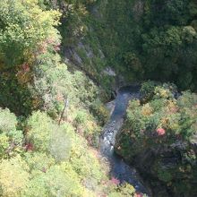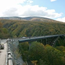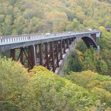 谷底からの高さは122mもあって、目もくらむような谷底や周辺の山々の紅葉は始まったばかりのようでしたがよかったです。橋の前後に駐車スペースがありますがそれほど広くないため、駐車場は結構混んでいました。