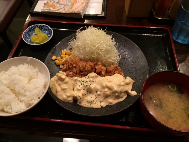 鶏南蛮に山盛りキャベツ、ご飯、味噌汁で500円。