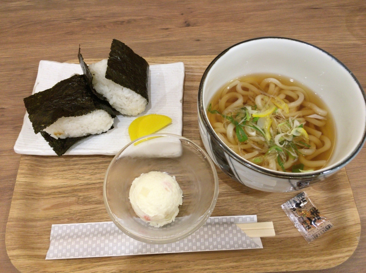 うどんの量と、おにぎりの大きさ、小鉢が既製品のポテトサラダで、特に満足感のあるものがなかったです。