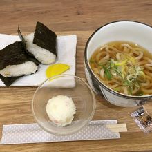 その中で、この店だけ高級感ぎありますが、朝食の時間帯に小うどんとおにぎりのセット600円があったので注文しました。