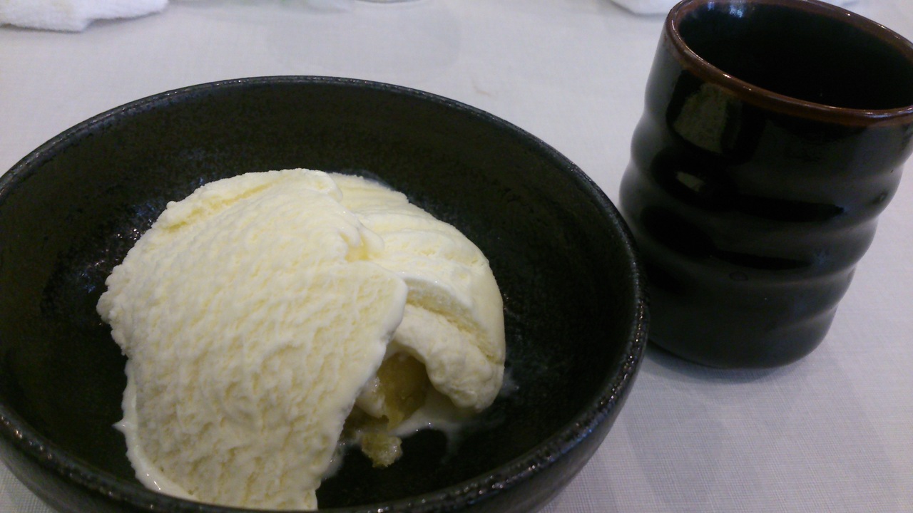 デザートは温かいさつまいもにバニラアイスがのってました。