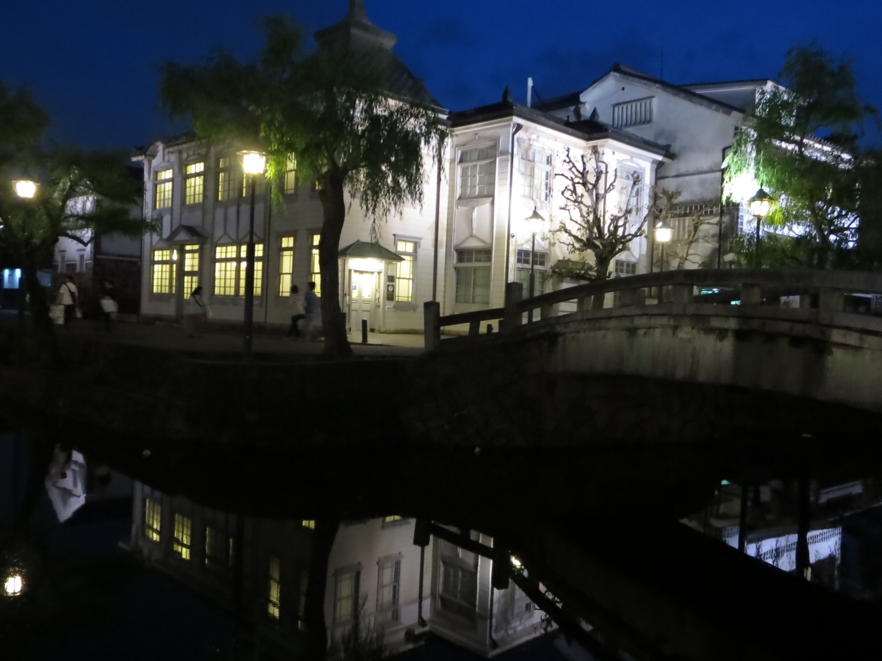 川沿いでいい味を出しています。重要伝統的建造物群保存地区の中心にあります。倉敷町役場として建てられています。木造の二階建てで、下見板張りの西洋館です。白壁の街並みの中でも目立っていて、夜も昼も雰囲気がいいです。