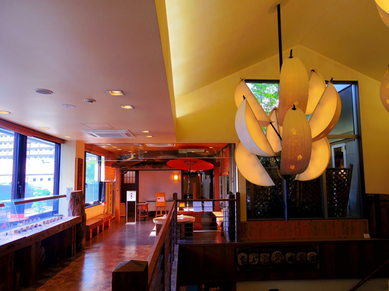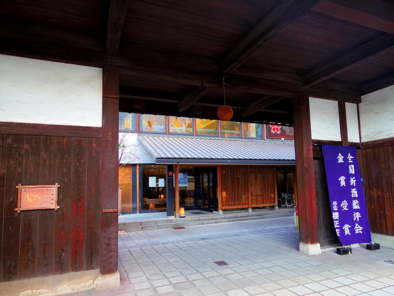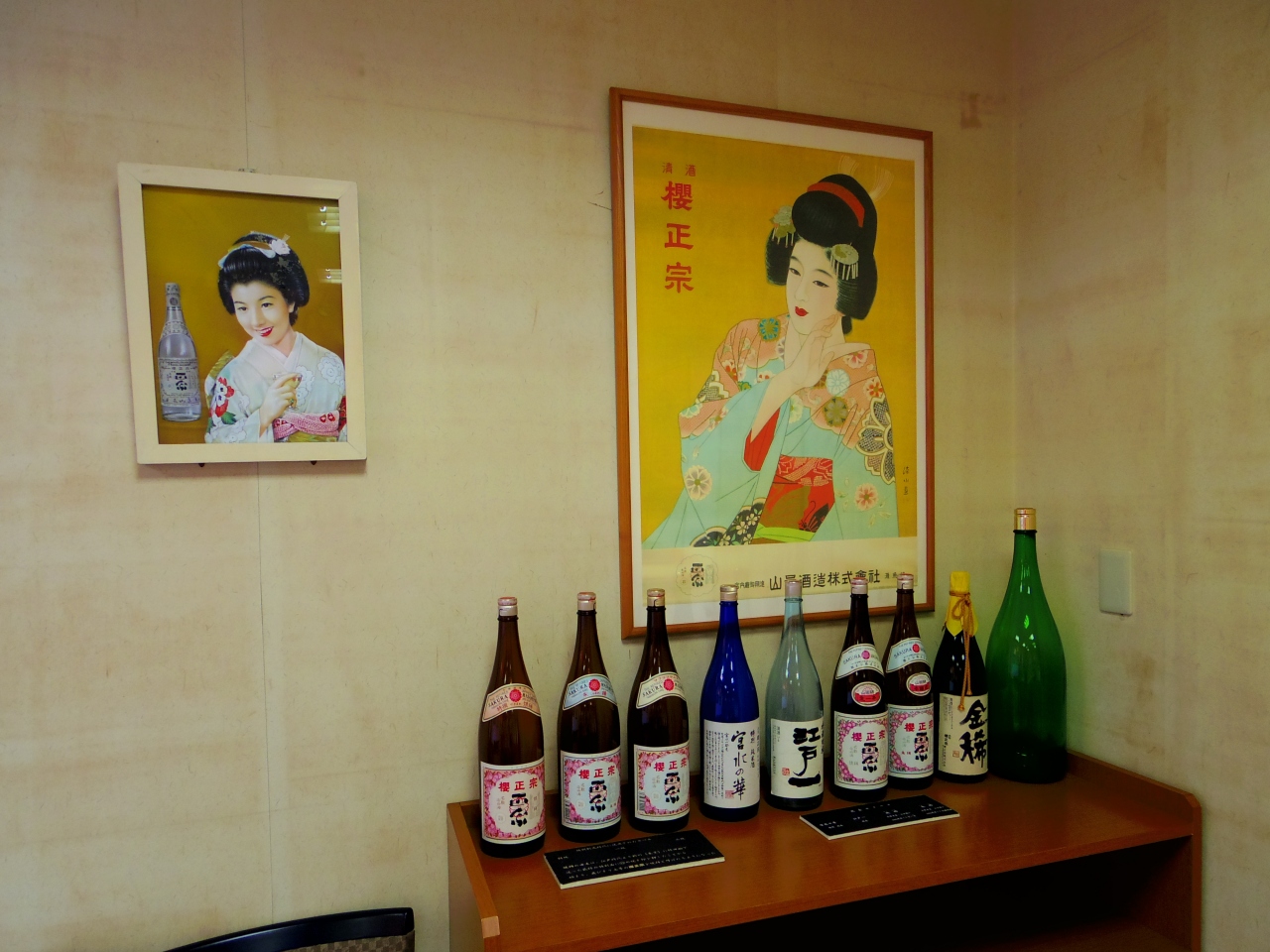 「櫻宴」は、1階が喫茶店と直売所になっていて、中央の階段を上って2階に上がると、酒造道具や昔の看板、酒瓶、ラベルなどが展示してある蔵町通りになっていて、奥には酒蔵ダイニングと三杯屋という飲食施設がありました。