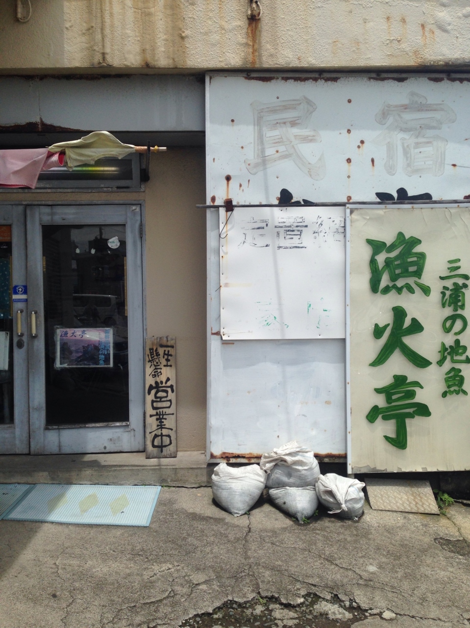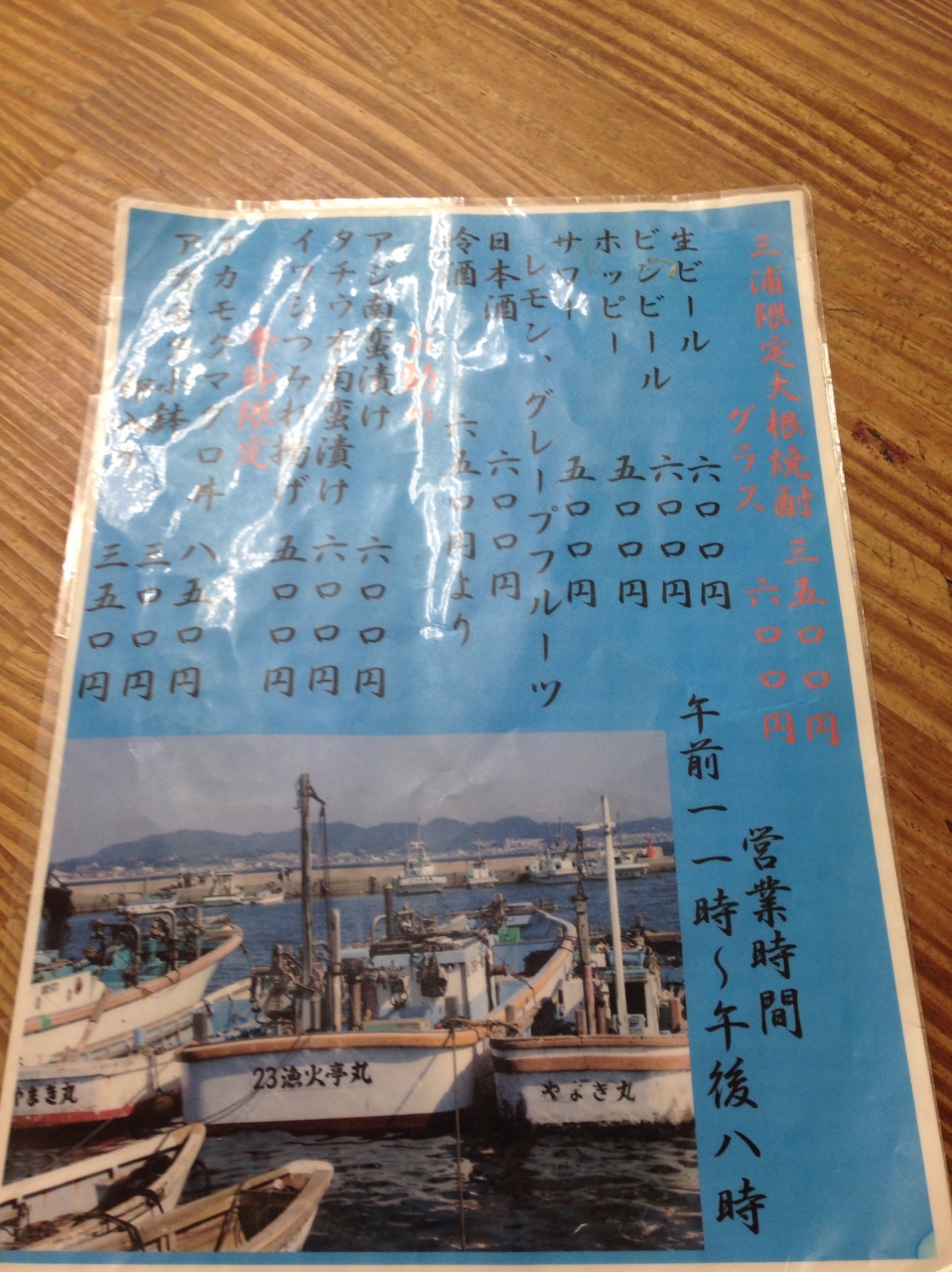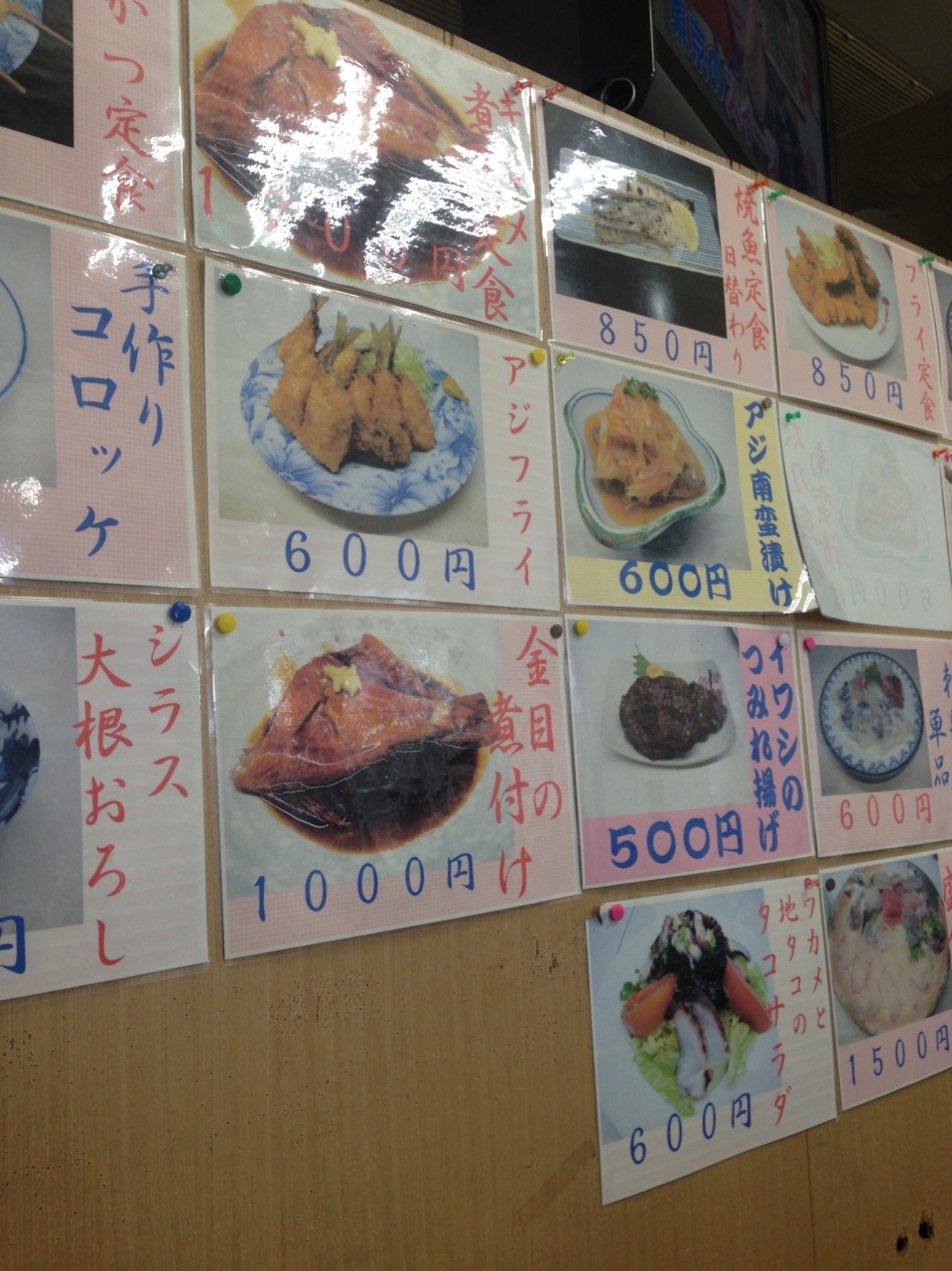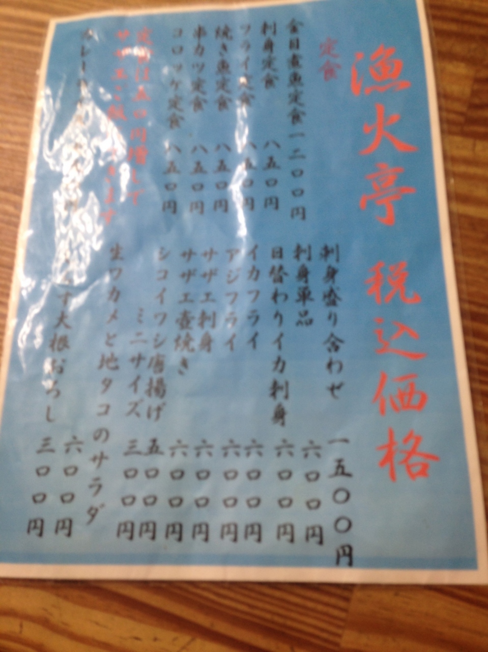 土曜のお昼に思い立って車でやってきました。カーナビで周辺で案内が終了し、店がどこにあるのかさっぱりわからないので主人が駐車場に駐車している間にgooglemapを見つつやっと発見。134号線と214号線がぶつかる角、海わ屋隣のピザーラが入るビルの一階角が漁火亭でした。駐車場がないので海の前の駐車場に停めましたが、自己責任でお店の前に駐車する人もおりました。店内は町の食堂という感じです。混んでると合席もあるので並んで座ってと言われました。お店は地元のおばちゃん達が切り盛りしています。