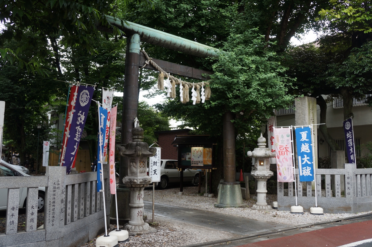上神明天祖神社。都営浅草線・中延駅 や東急大井町線・中延駅 からも徒歩圏内ですが、今回はJR横須賀線・西大井駅から歩きました。8分程度でしょうか。 この辺り(荏原・中延)はもともと「蛇窪村」という地名だったそうです。