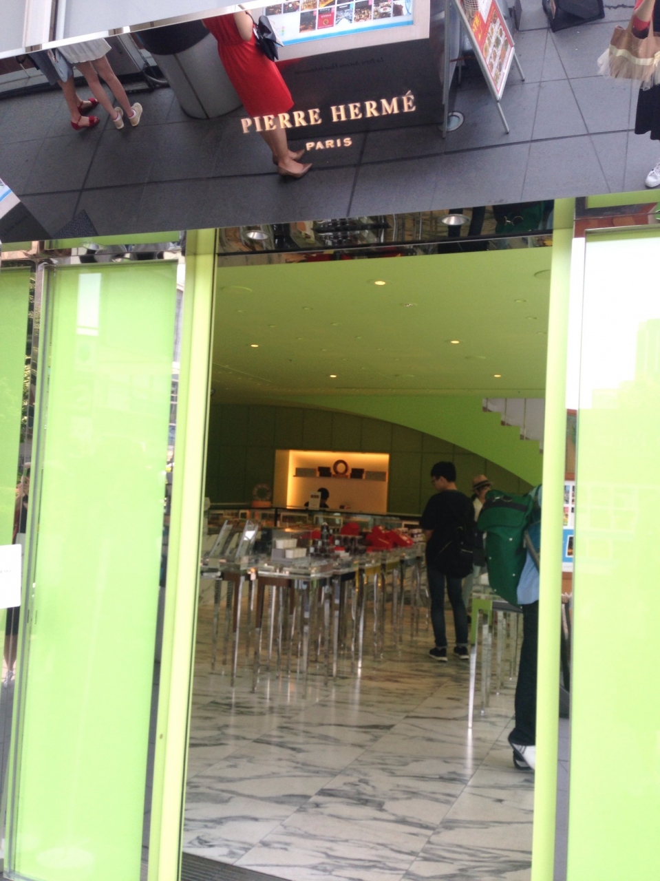 お世話になったひとへのお土産を探していたので、ラポルトに入っているピエールエルメへ。外観からちょっと入りづらい雰囲気です。入ると、お菓子屋さんというよりかはジュエリー屋さんというような雰囲気。お値段見たらびっくりしました。ケーキはどれも700円はします。ならマカロンなら買えるかなと思ったら1つ300円以上!。試食させてもらえて、すごく味はおいしかったです。