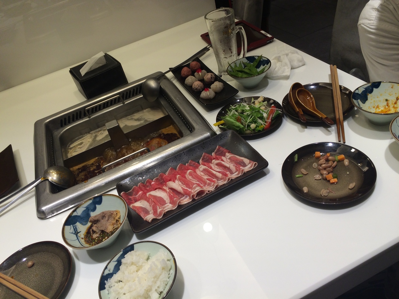 日曜日の夜19時半頃に2人で行きました。満席で30分くらい待って案内されました。火鍋のスープは2種類(辛いのと白いの)にして、ラム肉半人前、牛半人前、すり身団子盛り合わせ、餃子、ビール4杯を頼みました。タレは自分でいろいろ合わせて作りました。ご飯もお代わり自由でした。肉そぼろ、ネギ、黒酢で作ったタレはご飯にかけて食べてもおいしかったです。火鍋もおいしく、お店の方がスープを入れに来てくれたり注文がきちんと届いているか見てくれたり、セルフのデザートのオレンジをお皿に入れて持ってきてくれたりと、とても気配りができていて嬉しかったです。2人でこれだけ食べて9,000円ほどでした。