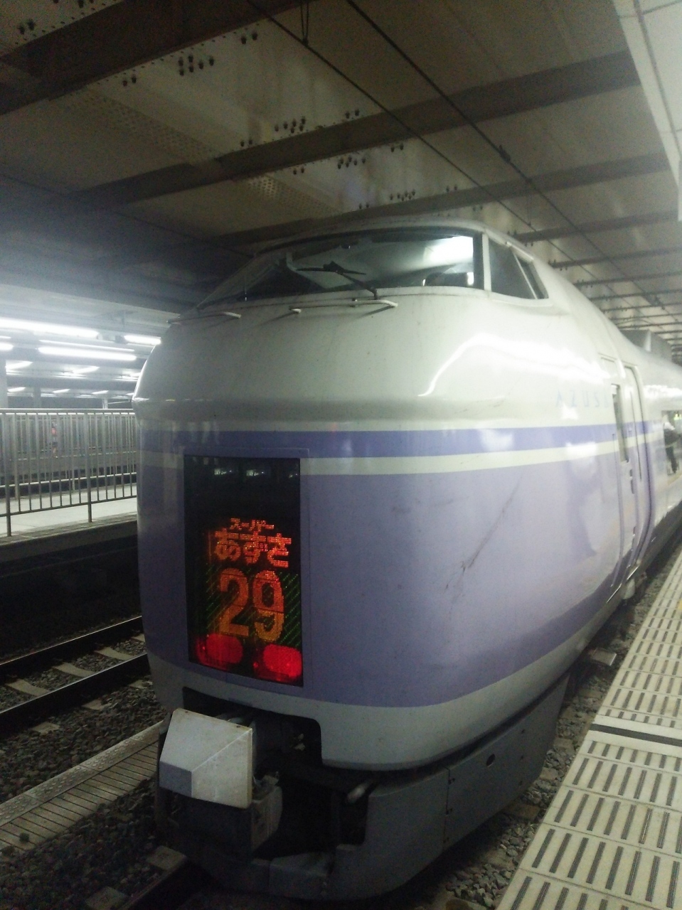 新宿駅と松本駅を結ぶJRの特急列車です。平日の夕方ではありましたが、ホームには乗車待ちの人たちが結構並んでいました。最近の出張や旅行では飛行機や新幹線を利用することが多いですが、「あずさ」は、ゆっくりと景色などを楽しみながら移動ができるのが趣深くて良いです。