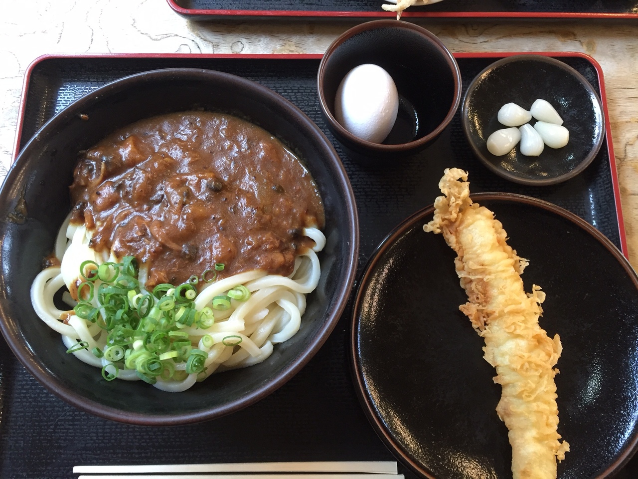 こちらのお勧めはカレーうどん。とろりとしたカレーにもちっとした麺が絡んで、とても美味しいです。生卵を割り入れて食べると、マイルドになります。