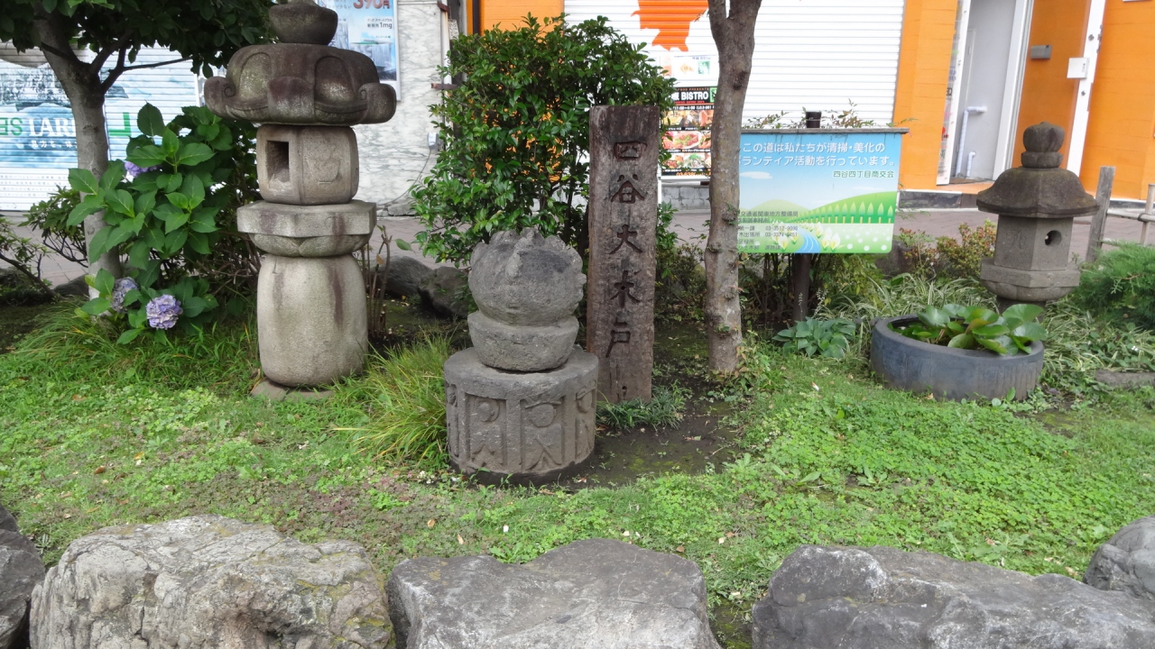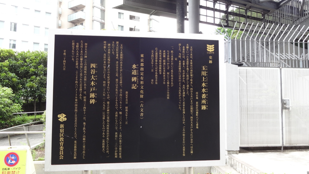 四谷大木戸跡の碑は玉川上水記念碑の近くにありますが、昭和34年に地下鉄丸ノ内線工事で発見された玉川上水の石樋を利用して作られたものです。実際の場所は、ここから80m東の四谷四丁目交差点付近にあったそうです。四谷大木戸というのは、甲州街道を通って江戸に出入りする通行人や荷物を取り締まるためのいわゆる関所のことです。新宿御苑の「大木戸」門という名の意味がようやく理解できました。