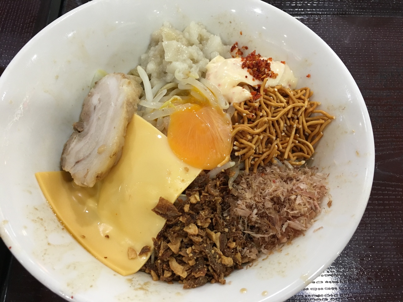 極太麺に ニンニク・チーズ・アブラ・エビマヨ・辛味・ベビースターラーメンがトッピングされ、中央には卵黄がのっています。