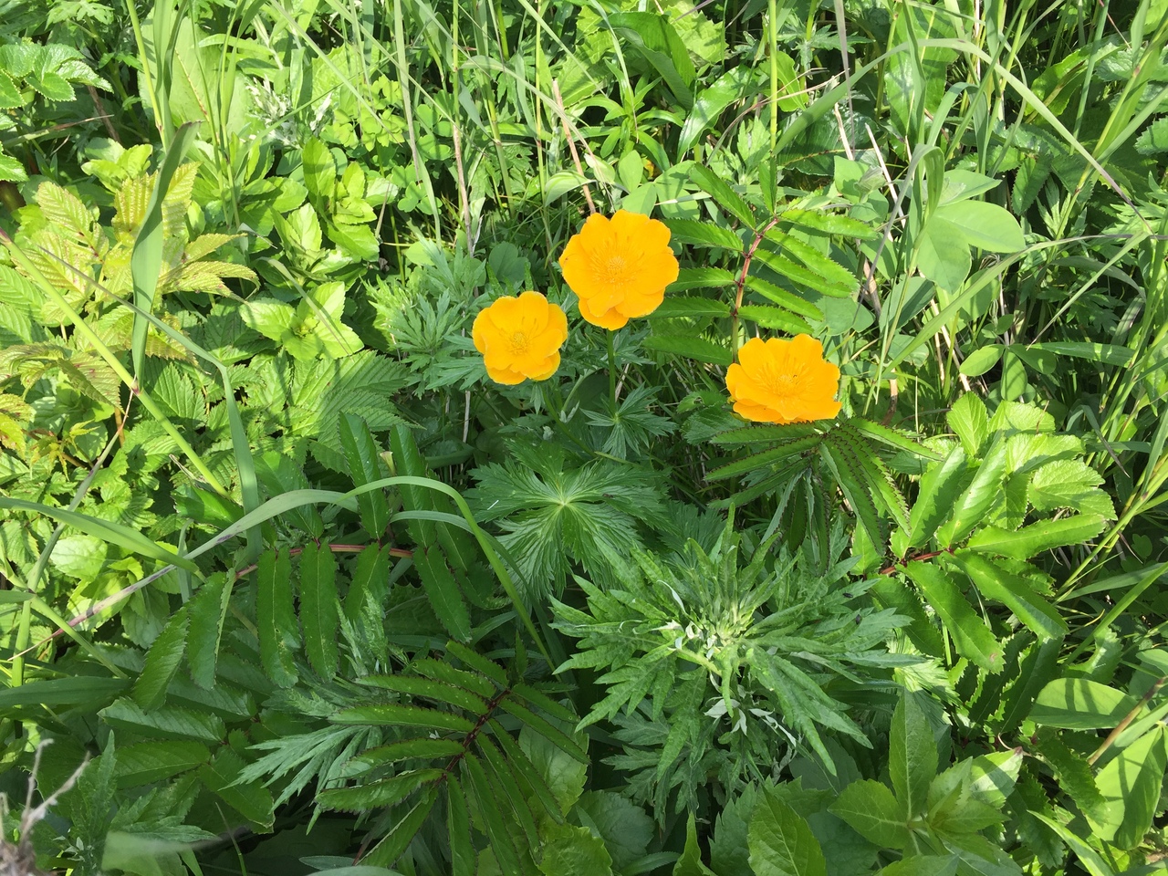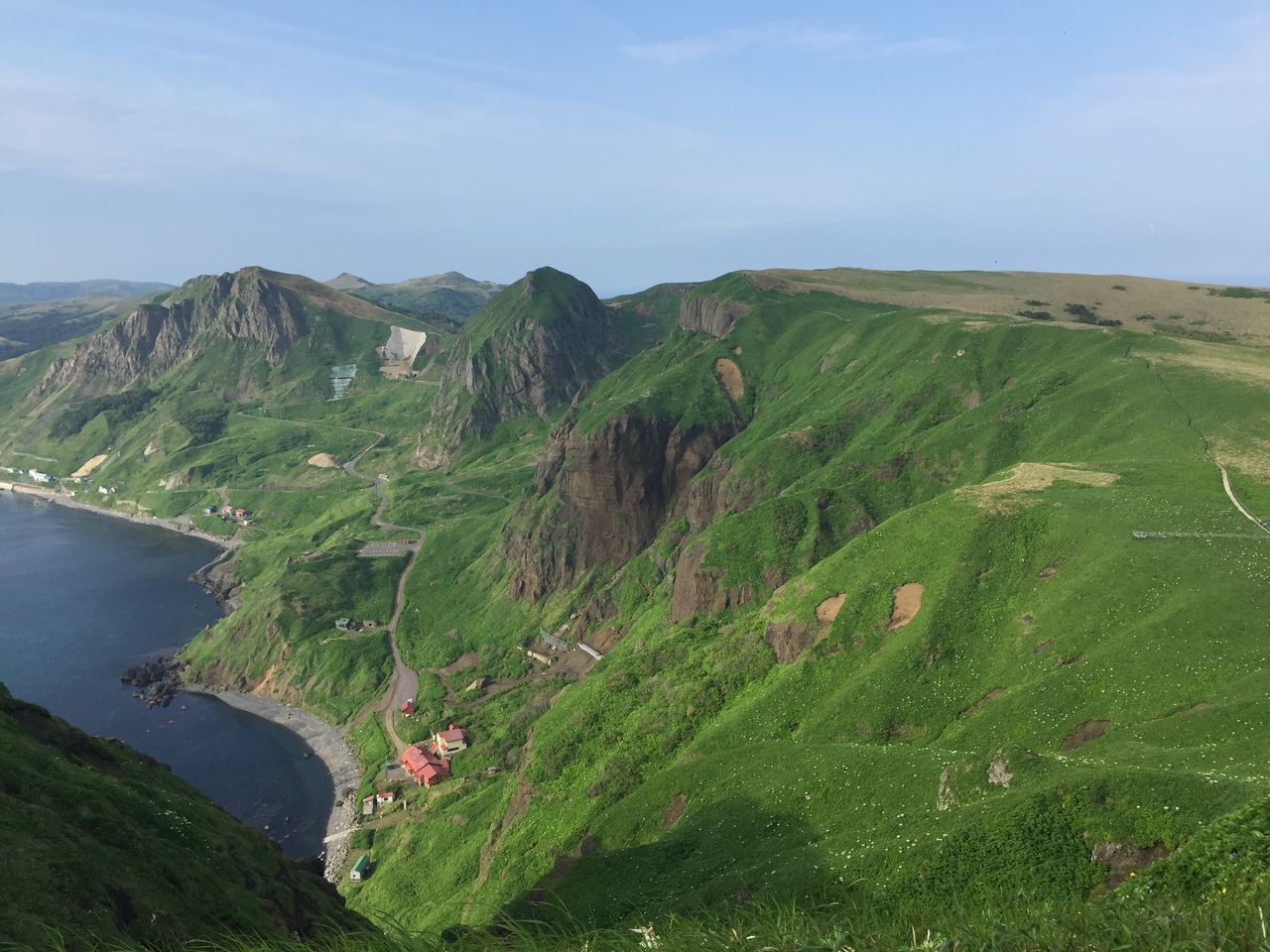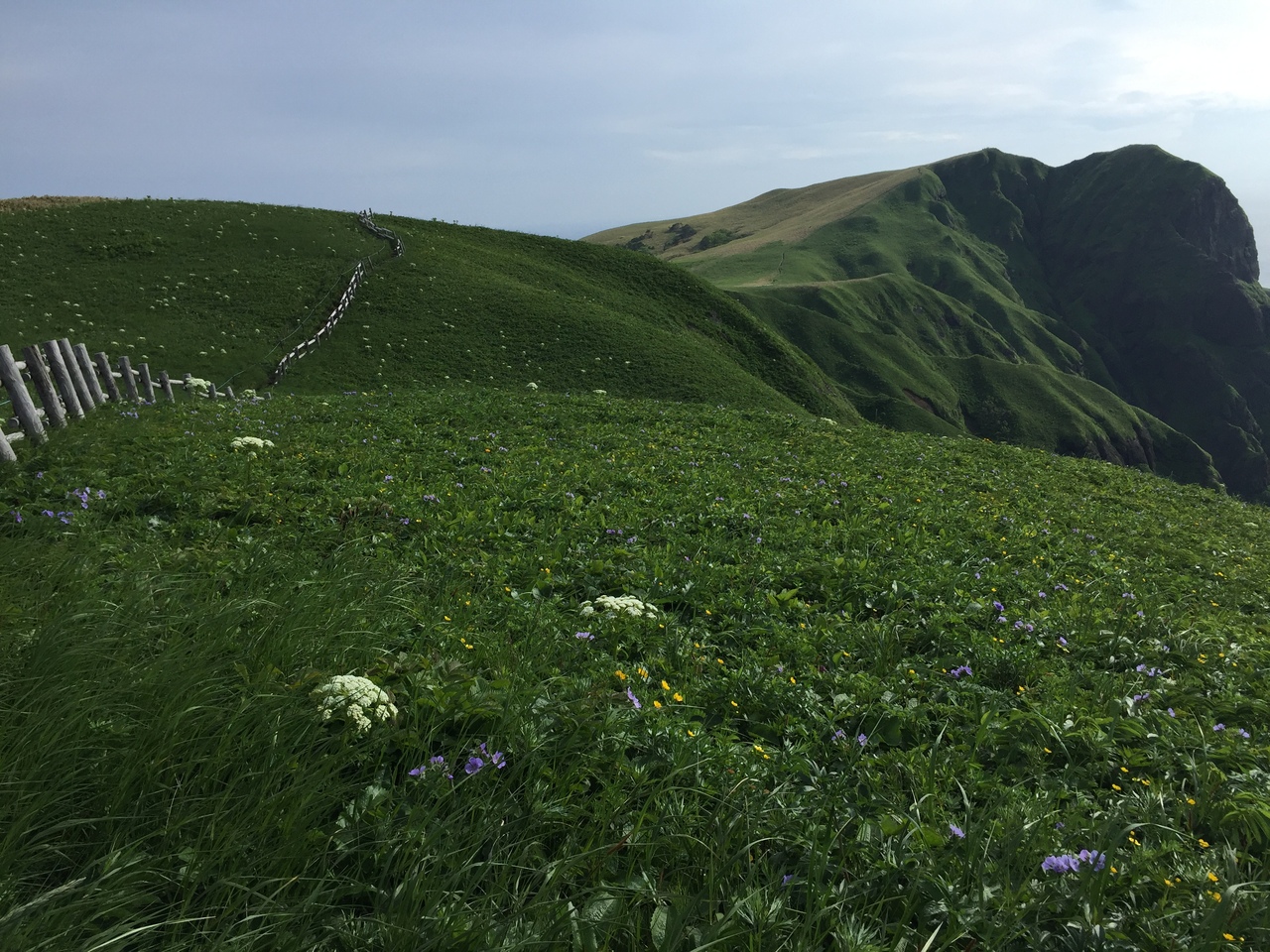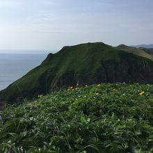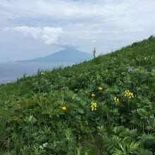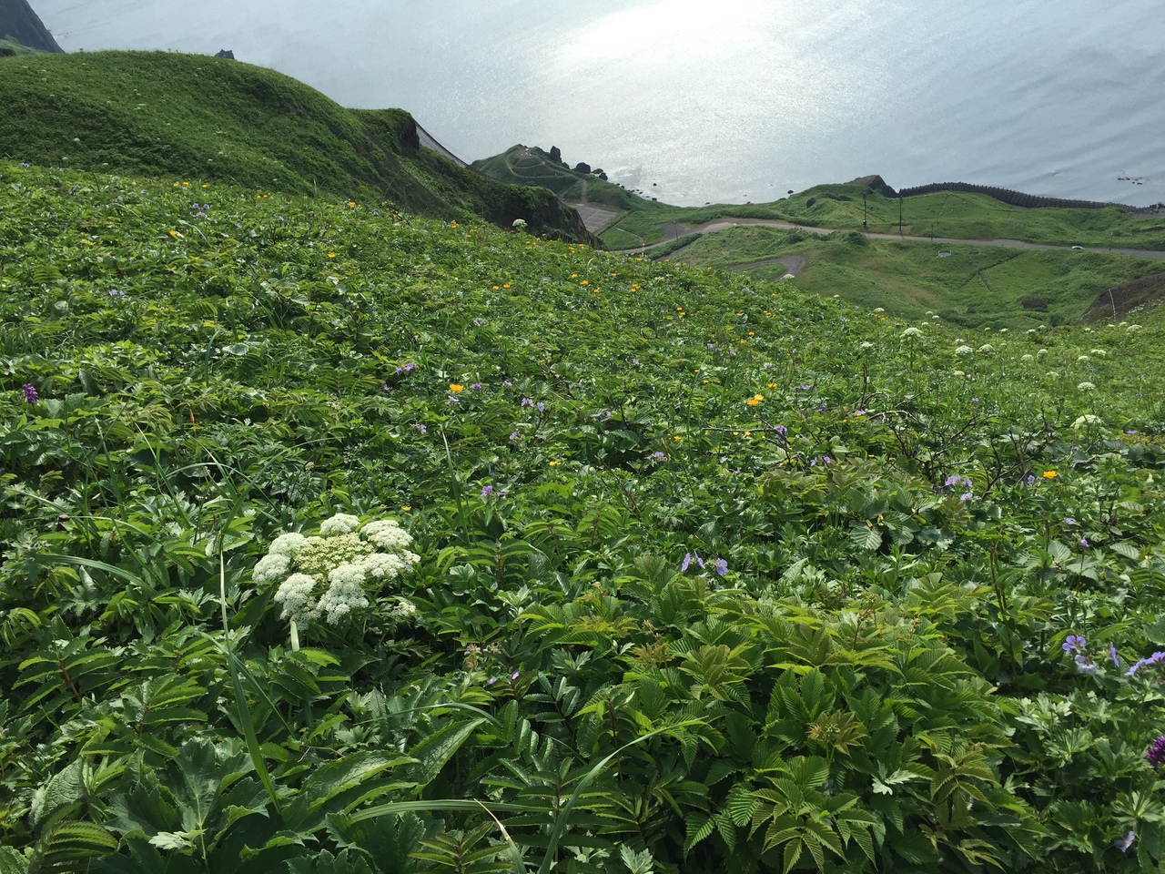 チシマフウロの紫 レブンキンバイソウの濃い黄 レブンシオガマの白 それはそれは美しい花畑が広がり 海の景色とも相まって絶景!