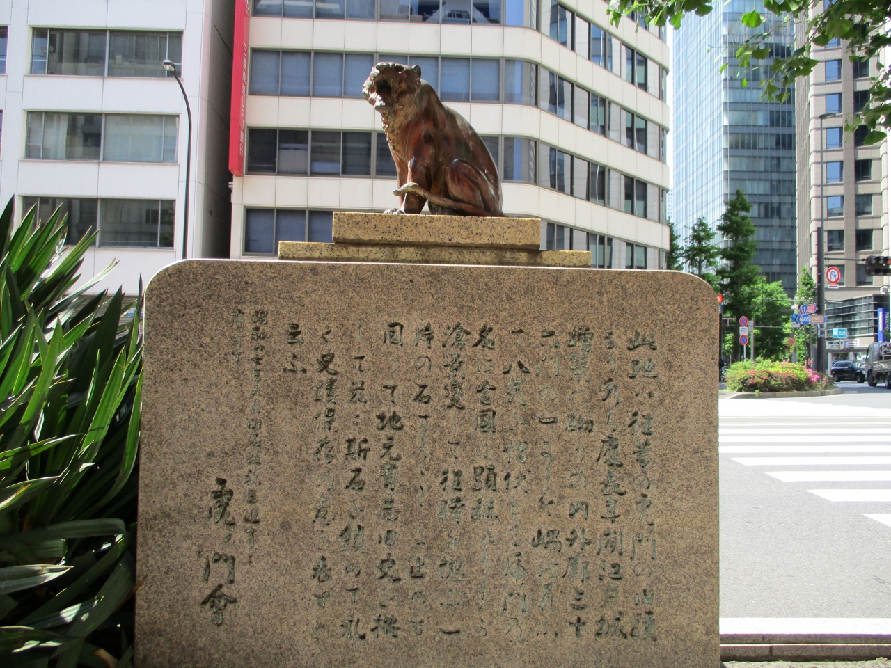 東京メトロ銀座線虎ノ門駅八番出口出た虎ノ門交差点の一角に小さな可愛い虎(猫ちゃんではない)像の虎ノ門遺址の碑があります。虎ノ門遺址の碑台座の碑文が良く読めないのが残念でなりませんが是非地元の有志商店街によって建立されたようですので少し虎も寂しそうなので東京オリピック開催に合わせて再建して碑文が読めるようにして頂けると元気になれるかも~