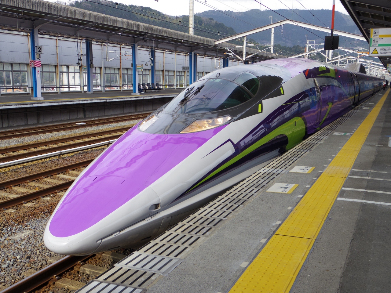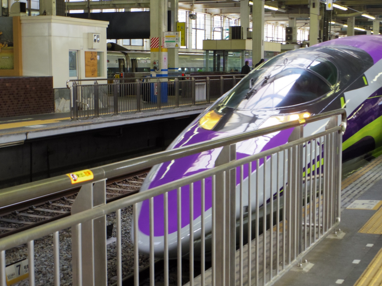 時間の都合上そうなっただけでしたが、エヴァンゲリオン新幹線とは知らず、遠くに見えたときにもしや、と思い、ホームに滑り込んでくる先頭車両をあわてて撮影しようとしたところ、多くの乗客がケイタイなどで撮影しようと構えていました。