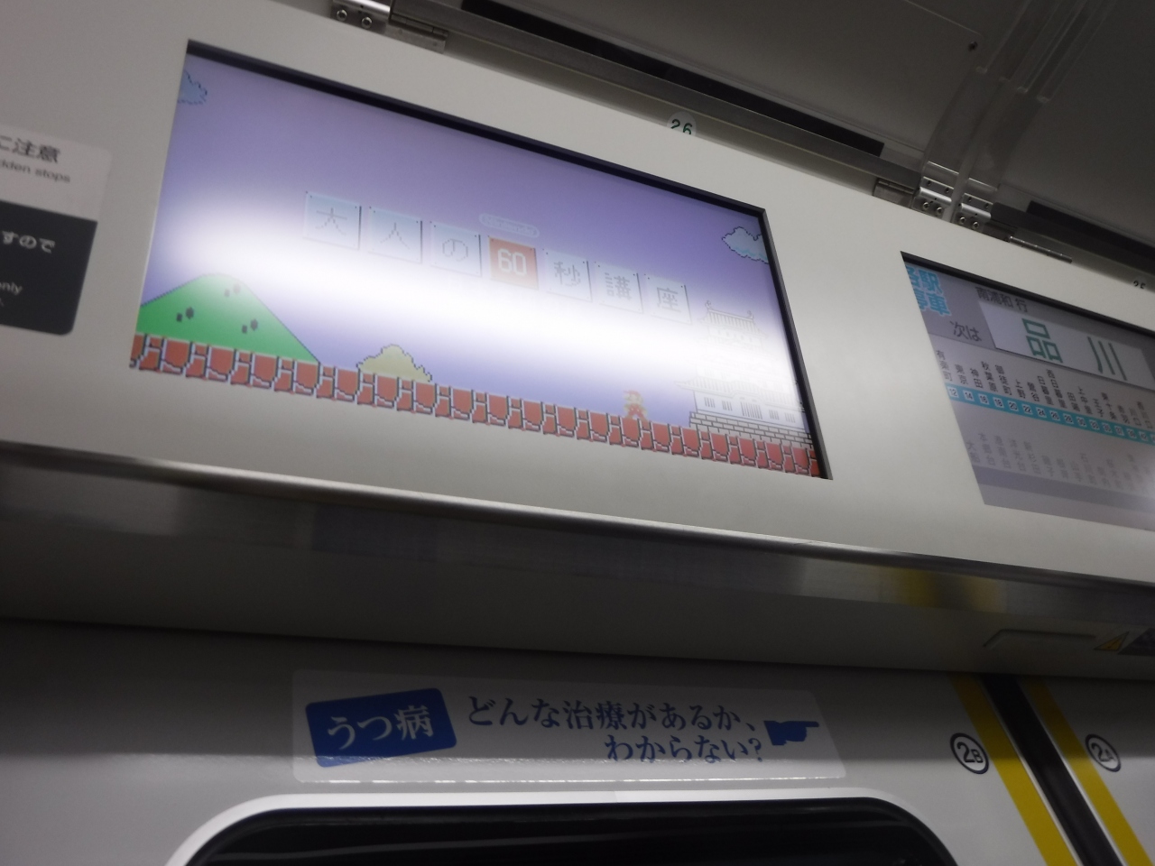 JRの青いラインの入った電車です。埼玉から神奈川へ走る電車です。都内からは山手線と並行して品川まで走ります。電車のなかではドアの上にモニターがあり、CMや天気予報、ニュースやクイズなどが放映されており、それを見ているだけでもけっこう楽しめます。