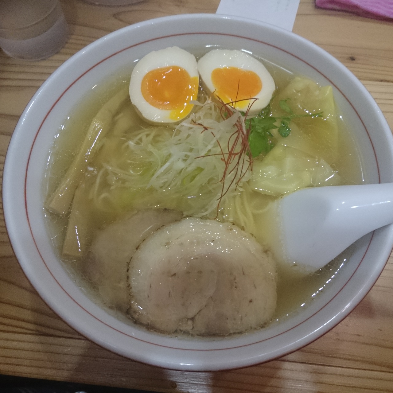 注文すると紙エプロンとゴムがいるか聞かれます。店内には店主のこだわりがわかる説明があります。塩と醤油があり、おすすめの塩にしましたが出汁がきいていておいしかったです。卵の半熟具合もよく、全部のせがおすすめです。