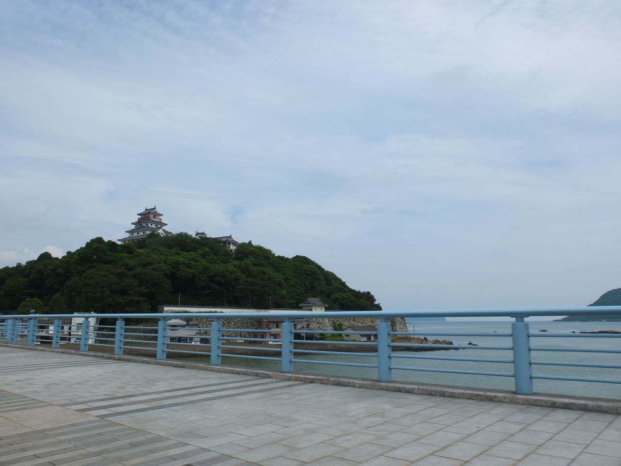 虹ノ松原側から来ると正面やや右手の山の上に唐津城の天守閣が見えます。夜のライトアップのときはきれいです。
