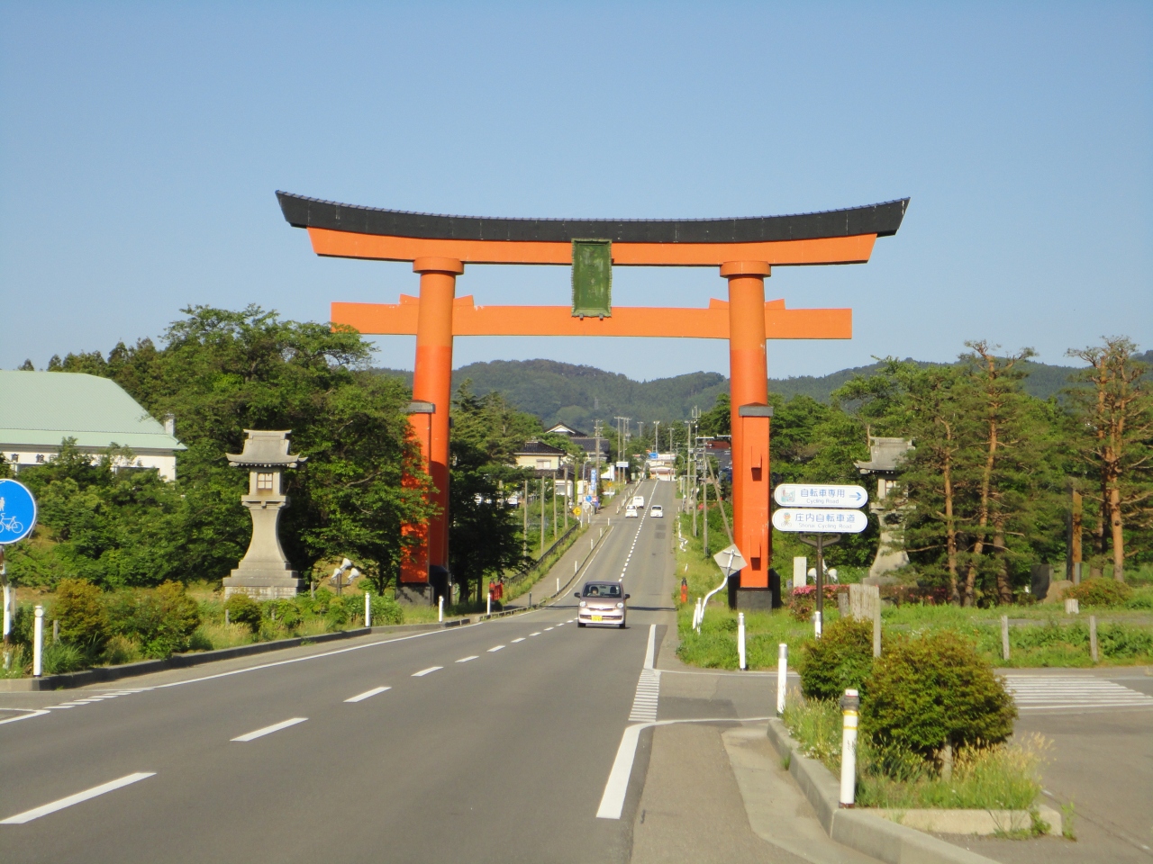 羽黒山の五重塔を見るために、車を走らせていたら目の前に巨大な赤い鳥居が見えてきました。最初はよくわからなかったのですが、羽黒山の神社の人に尋ねたらここの神社の鳥居ですよと言われたので、五重塔を見終わってから帰り道にこの鳥居を撮影することにしました。とにかく、真っ赤な鳥居が大きすぎて圧倒されます。鳥居の左には鳥海山、右には月山が見えていい景色を作っていました。