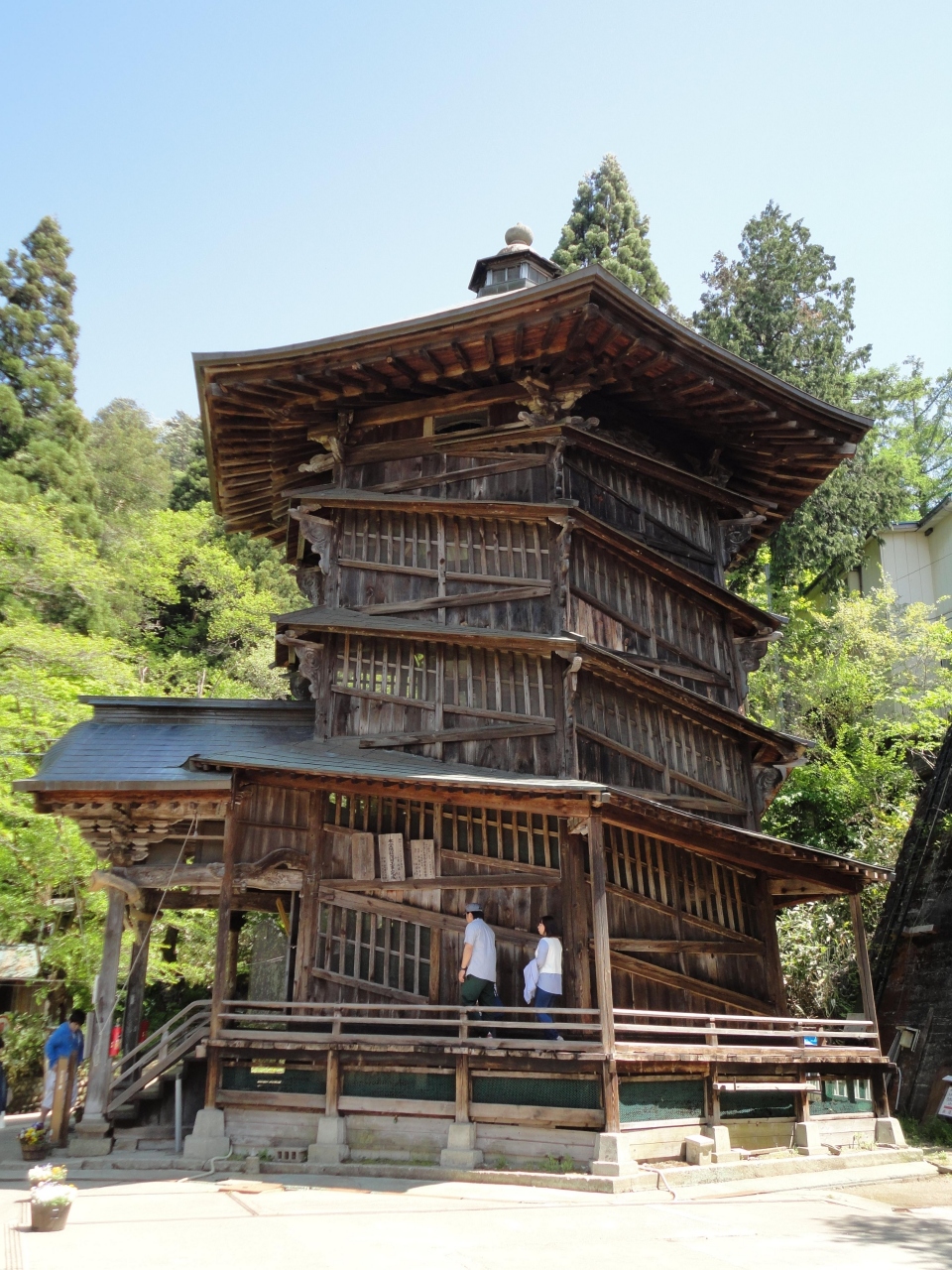 少し傾いているのかなと錯覚さえします。外の造りが斜め構造になっているからです。さざえという名前が付く所以がなるほどと思います。お堂の中は昇って行く時と下る時とでは全く違う所を通るということで、同じ所を通ると縁起が悪いからこの構造になったらしいです。世界的に見てもこういう建物はここ「さざえ堂」だけということですから、そのうち世界遺産候補に挙がるのではと思ってしまいます。