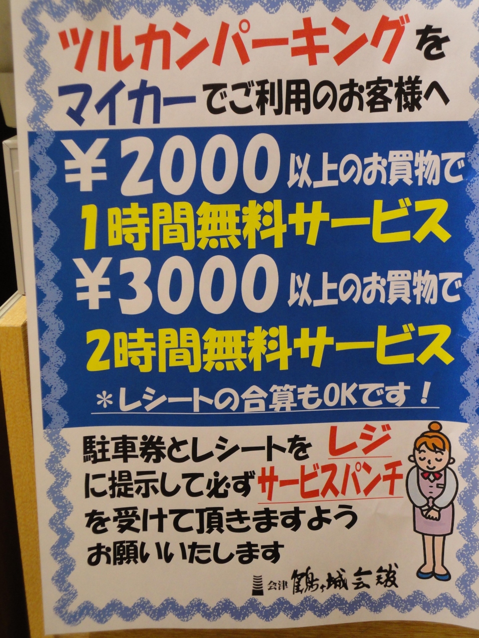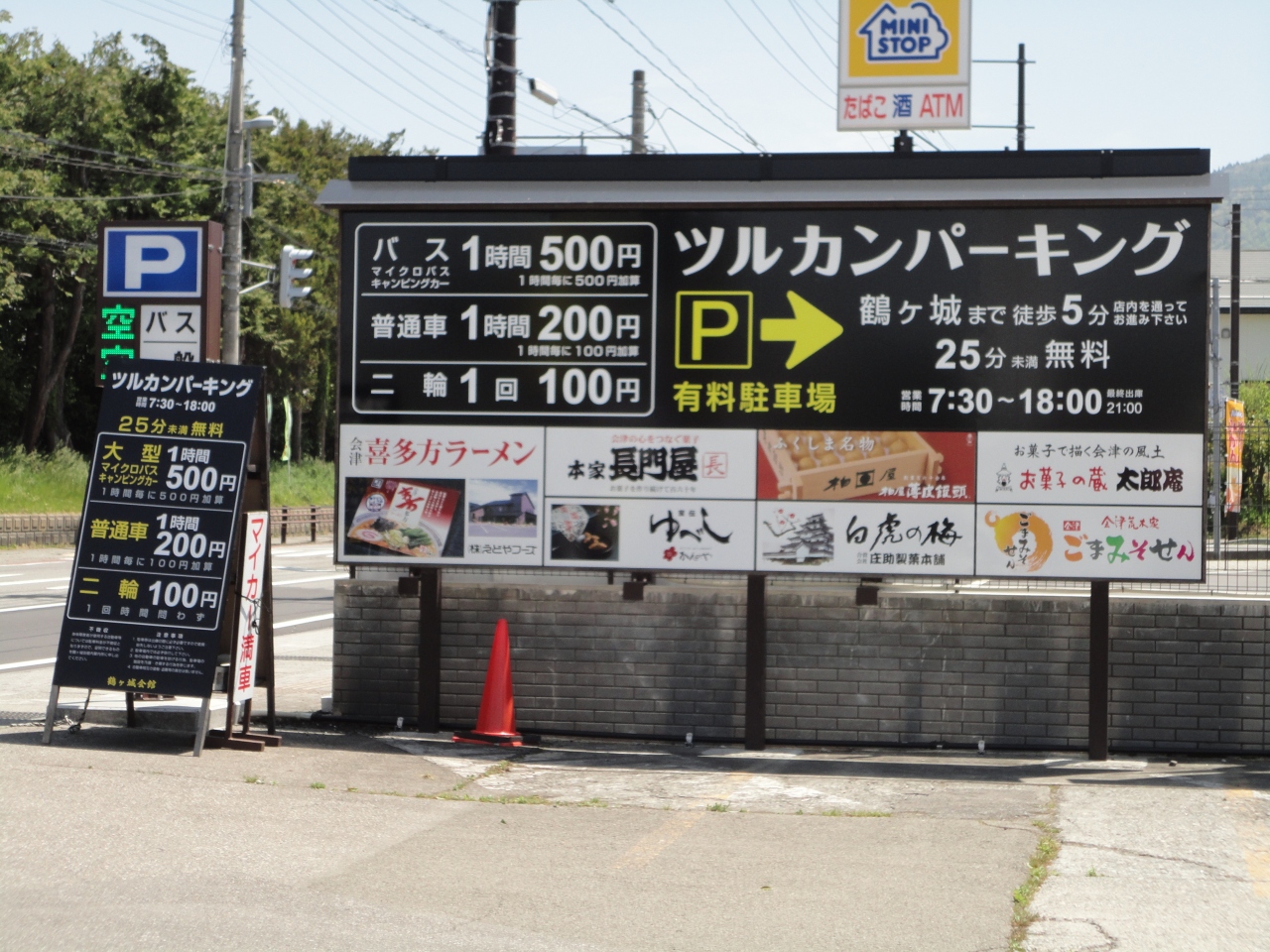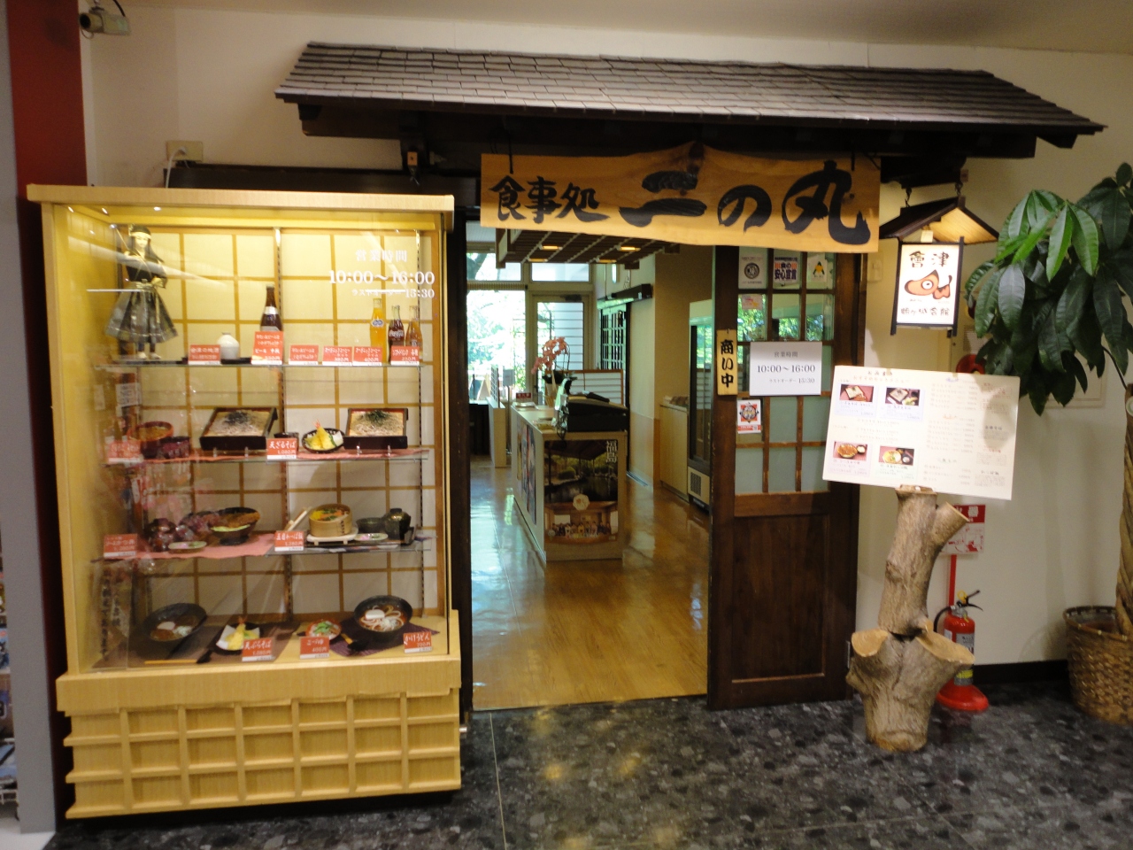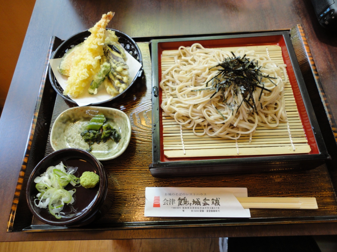 「鶴ヶ城観光+駐車場」とネットで検索したら、鶴ヶ城会館の駐車場が無料でいいと出ました。早速、翌日鶴ヶ城会館に行ってみたら、有料になっていて唖然としました。駐車場の係の人に尋ねたら、3月までは無料だったとのこと、今は5月だから仕方ないと思い、ここに車を駐めました。会館の中に入ったら、2千円以上の買い物で1時間無料、3千円以上の買い物で2時間無料という案内に気付き、お店の人に尋ねたら食事は館内の「二の丸」でするとその領収書を加えてもOKとのことで、鶴ヶ城観光が終わったらここで昼食を取ることに決めました。食事処二の丸で天ざるそば(1080円)を食べました。店内はまだ新しくて机や椅子もきれいでした。窓からの眺めも良くて、天ぷらと蕎麦がとても美味しかったです。会計を済まそうと思いレジへ行ったら、ソースカツ丼はJAF会員なら100円引きとの表示がありました。私もJAF会員ですので、ソースカツ丼を選べば良かったのになあと後悔しました。3時間くらい駐車しましたが、確か百円だけ払って出られたようです。