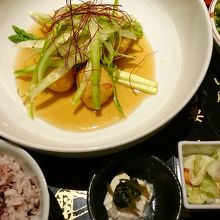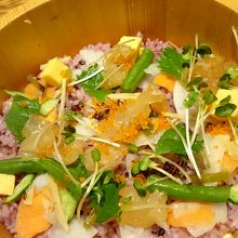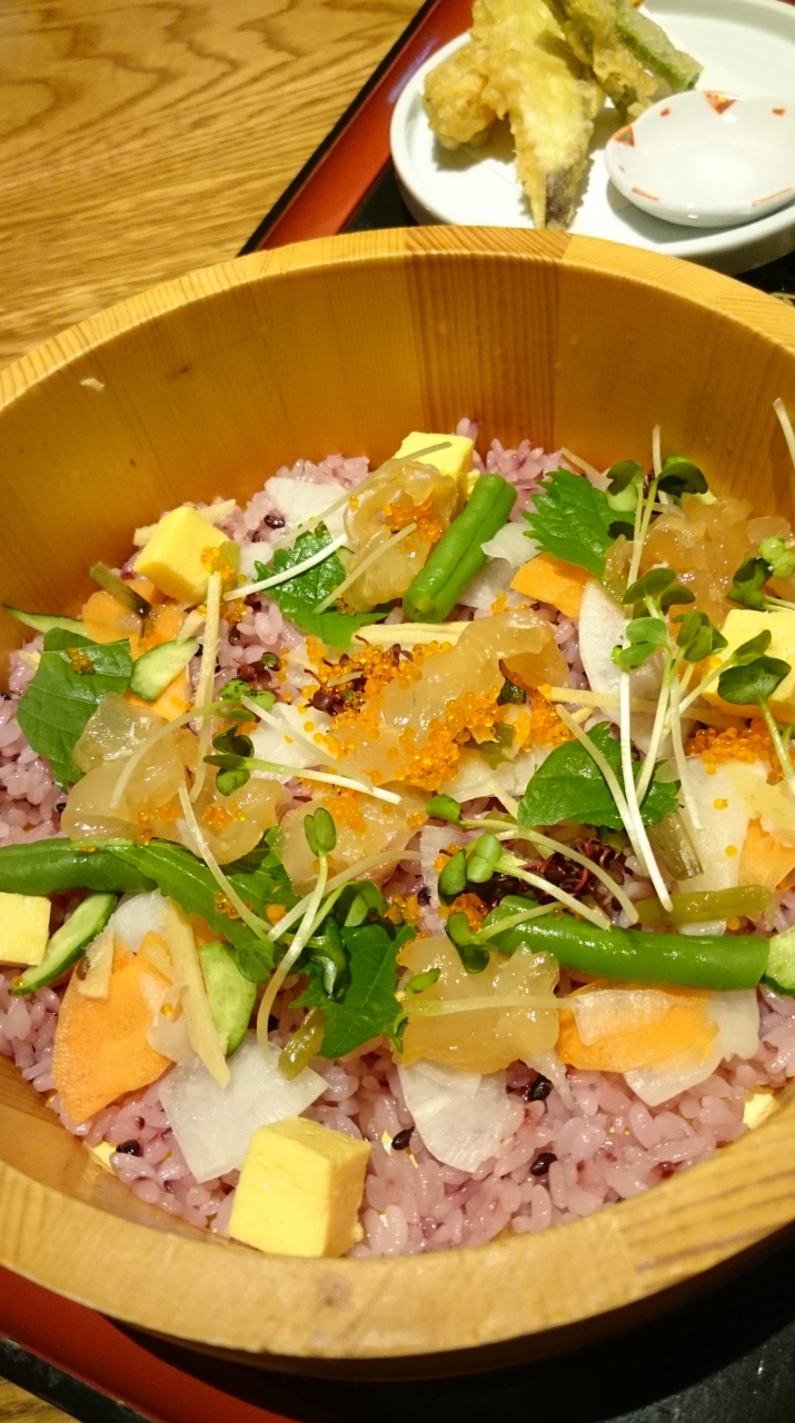 ディナーで食べた「農園バーニャカウダ」と「お野菜しゃぶしゃぶ」がとても美味しかったので、今回ランチで利用してみました。契約農家直送のランチメニューは7種類。カレーやハンバーグ、豚のせいろ蒸しなど野菜だけではないので食べやすそう。今回は「アスパラたっぷり肉団子のあんかけ定食」と「初夏のお野菜と鯛のちらし寿司 季節の天ぷら付き」をいただきましたが、ごはんがともにヘルシーな紫黒米入りご飯。私にはやや薄めの味付けでしたがボリュームはたっぷりでした。平日でも12時過ぎには満席になる人気ぶりでした。