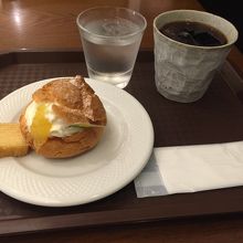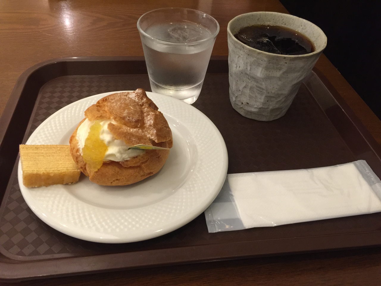 レモンシュークリームとアイスコーヒーのセットがワンコイン(500円)ということですかさず発注。クリームはふつうの味で、下の方にレモン味の板状のものがはさまっていただけで、ちょっと期待はずれ。カフェスペースには店員がおらず、いちいち1階までいかないといけない。