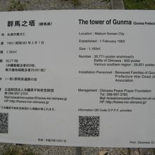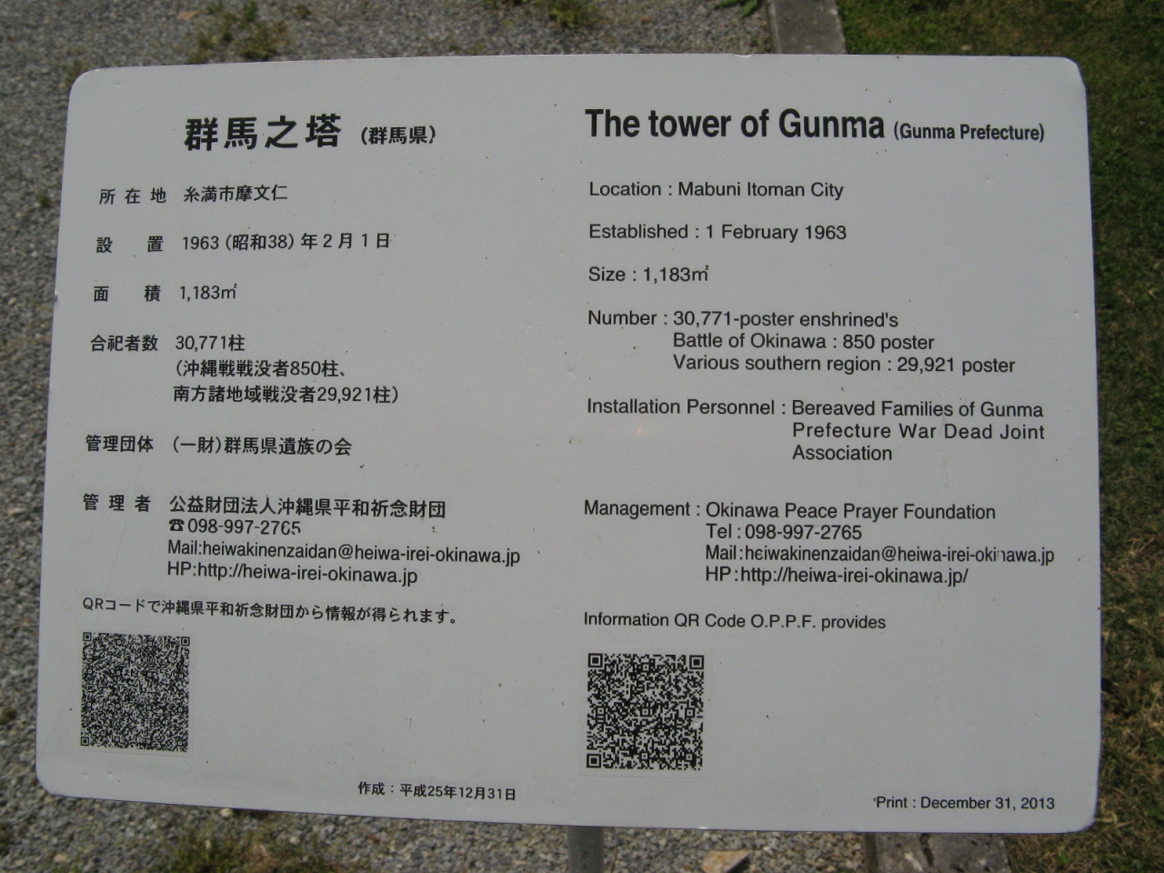 群馬の塔には太平洋戦争における群馬出身者のうち沖縄戦没者 800有余名と遠く南方の各戦線で戦没された 3万余名を一体として合祀されてあります。 主柱の三波石は平和への祈りをこめた合掌型で、遙か群馬に向かっていますから、郷里に在っても常に遙拝することが出来ます。