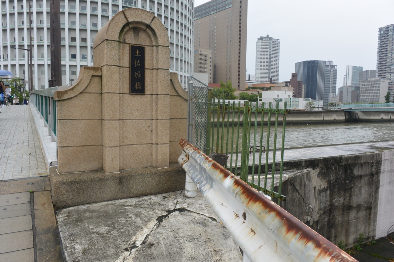 大正10年に架設され、昭和44年に改築されましたが、親柱は古いものを使っているようです。あみだ筋が土佐堀川を渡る橋で、橋に高さを持たせるためか、橋へ続く道はけっこうきつい上り坂になっています。橋を渡ると、住友病院やリーガロイヤルホテル、国際会議場などがあります。