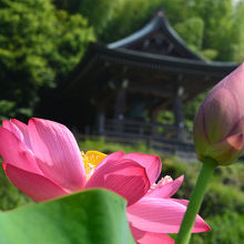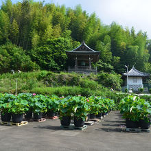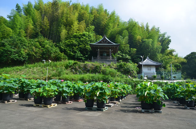 本堂・駐車場の西側の“白蓮香苑”にたくさんの鉢が並んでいます。ある情報では、直系約80センチの鉢が300個並んでいるそうです。その鉢に蓮が植えられていて、見ごたえがあります。