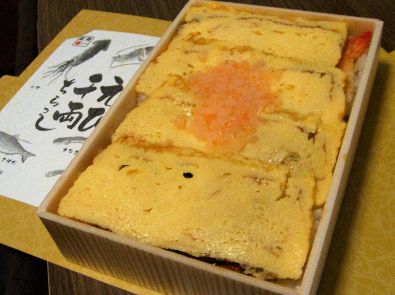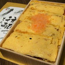フタを開けてみると4切れの玉子焼きが一面に敷かれ、海老のおぼろが上にかかっているだけ。