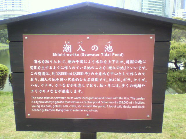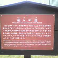 中央区にある都立の庭園、浜離宮恩賜庭園内にある大きな池です。こちらは東京湾の海水を引き入れた池で、潮の干満によって眺めが変わるそう…。