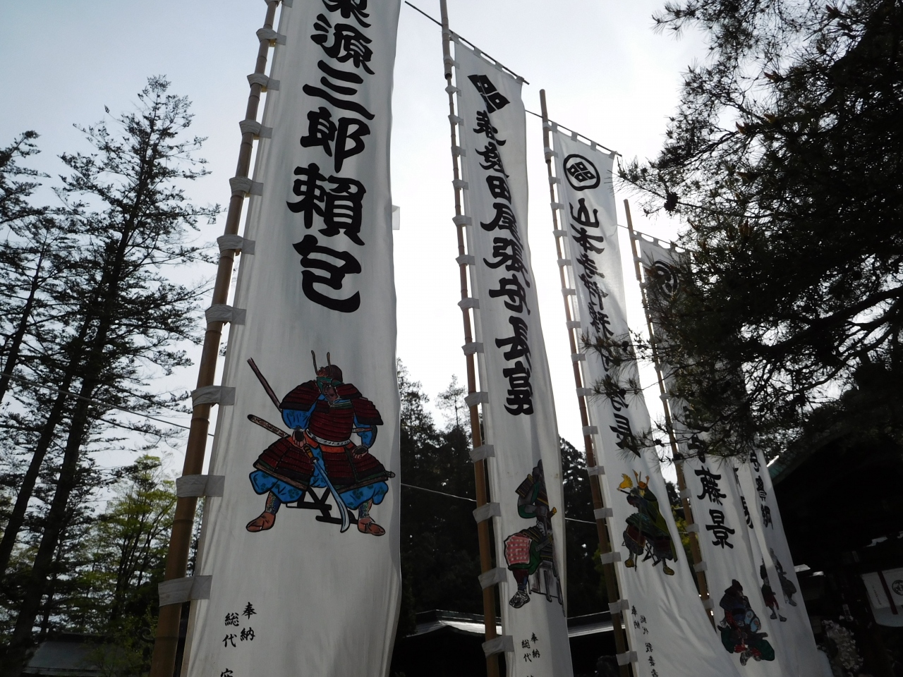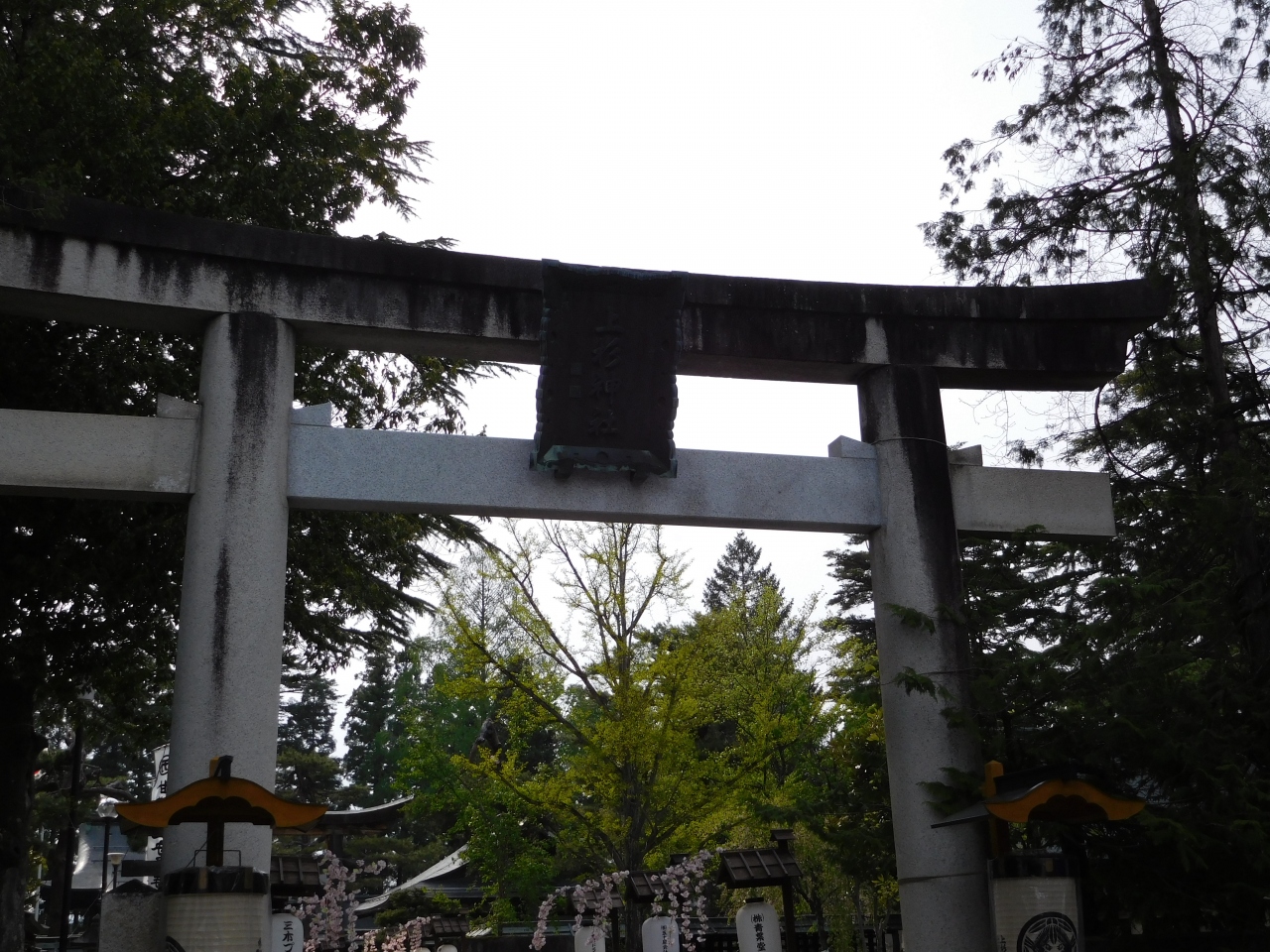 上杉謙信を祀る神社で、ゴールデンウィーク期間中に行われる「米沢上杉まつり」開催中に訪れたので、参道には沢山の屋台が立ち並び、夕方にも関わらず多くの参拝客が訪れていました。神社前には、沢山の提灯やのぼりがありました。上杉神社の神紋は、上杉家の家紋「竹に雀」で、よく見ると、2羽の雀の口が「阿吽」の形になっていました。