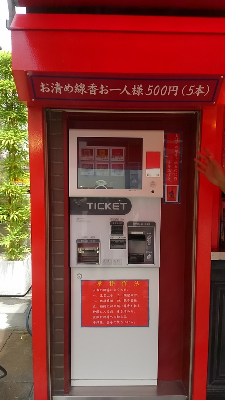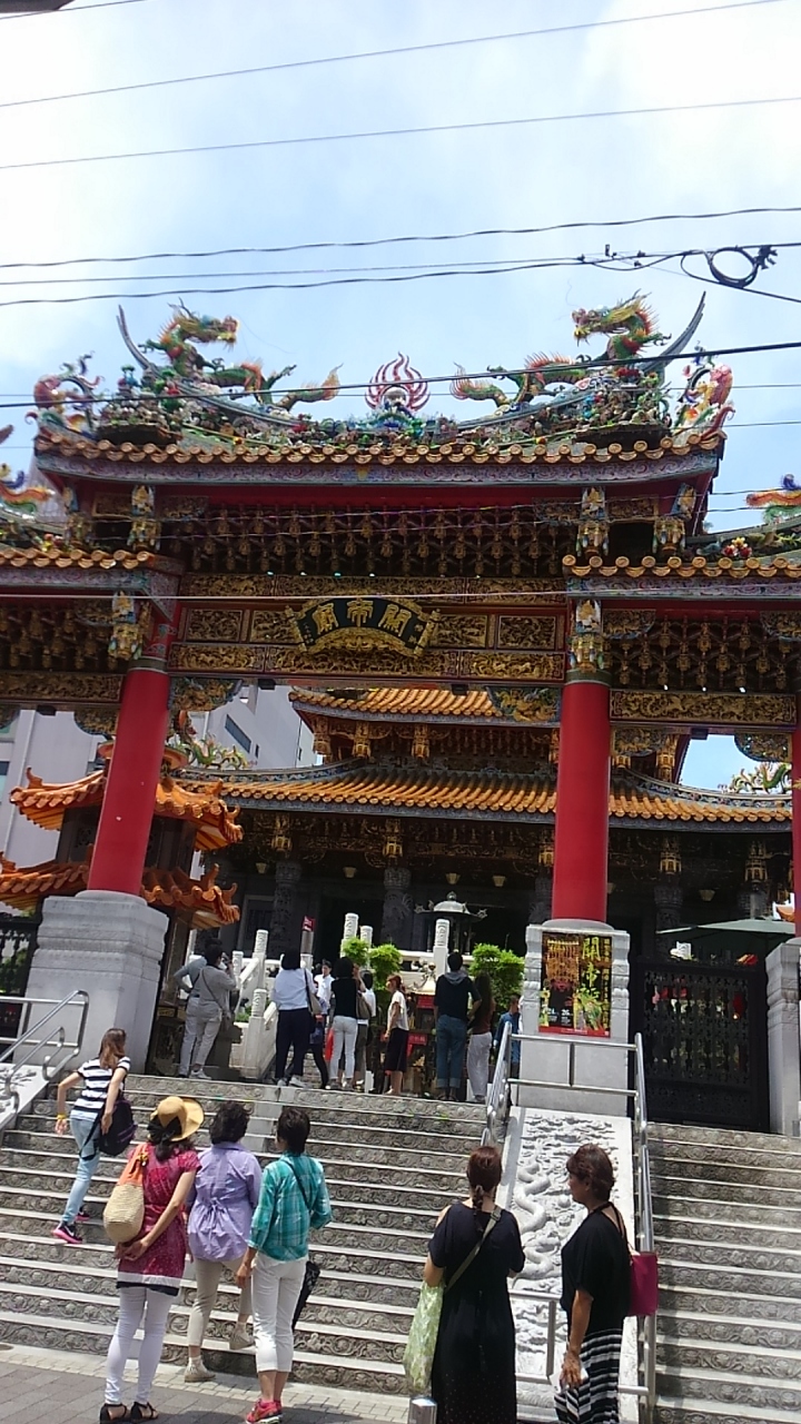 中華街の中にある有名なお寺?です。土曜日だったので中華街は超混雑。ここも観光客がたくさん来ていました。道路から階段を上がったところに、施設の中に入るための入館料として、お線香500円の自販機がありました。外からでも雰囲気は十分に楽しめました。