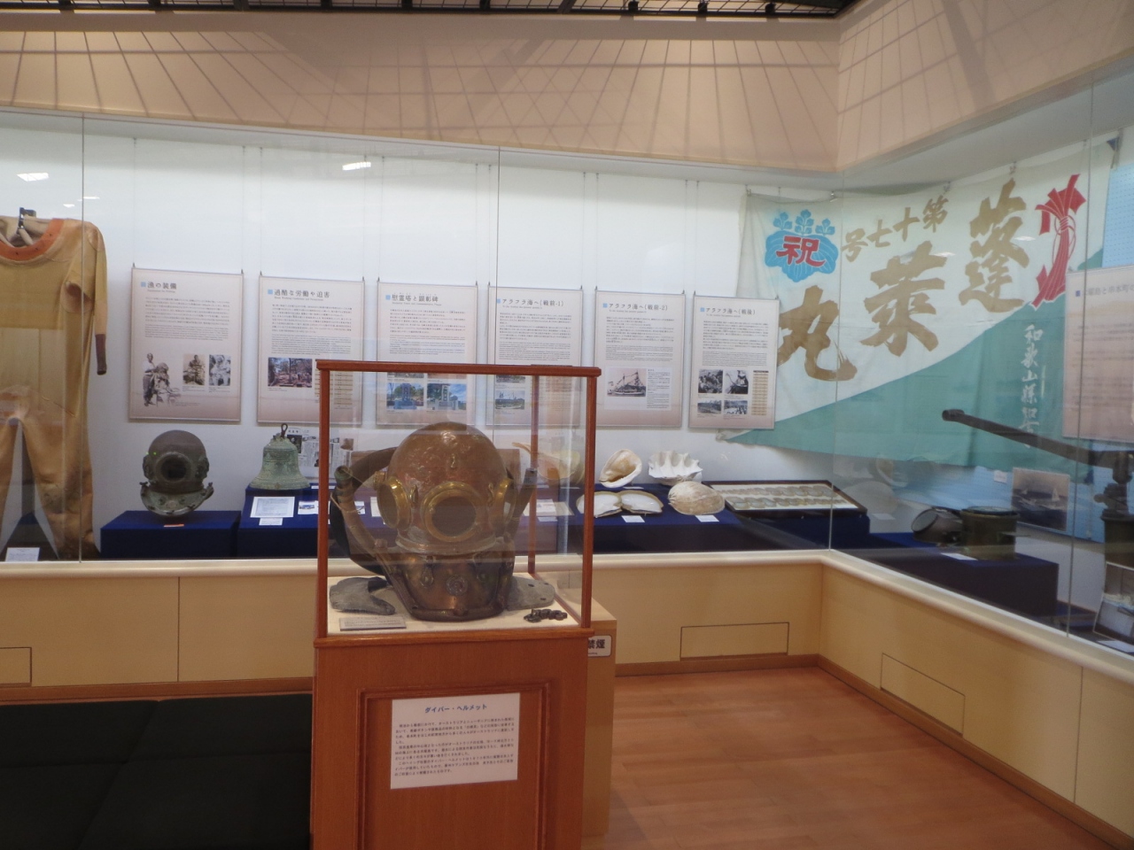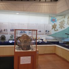 中は展示スペースや休憩所になってます。真珠貝、白蝶貝などの貝殻や、カップ潜水漁の潜水夫さんが着るスーツやヘルメット、機材などが資料と共に展示されていました。