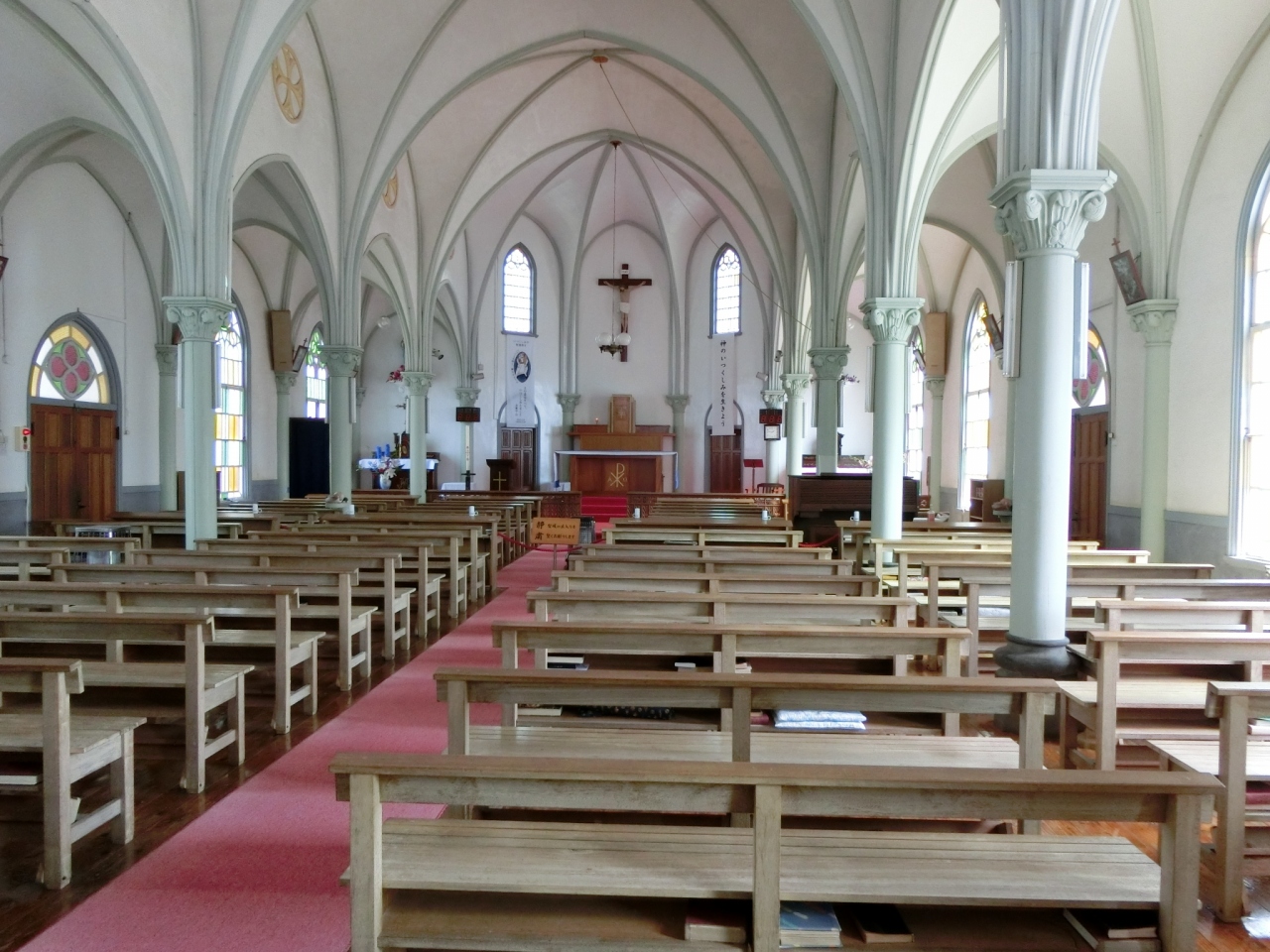 高台に建つ白亜の教会。教会の天井はこうもり傘を広げたような優美な曲線を描いていて、内装も白一色で落ち着いた雰囲気がありました。高台に墓石の上に十字架が載ったカトリックの墓所が見えたので丘を登ってゆくと、丘の頂きから青い海に白亜の教会が映えて絶好の景色が堪能できました。