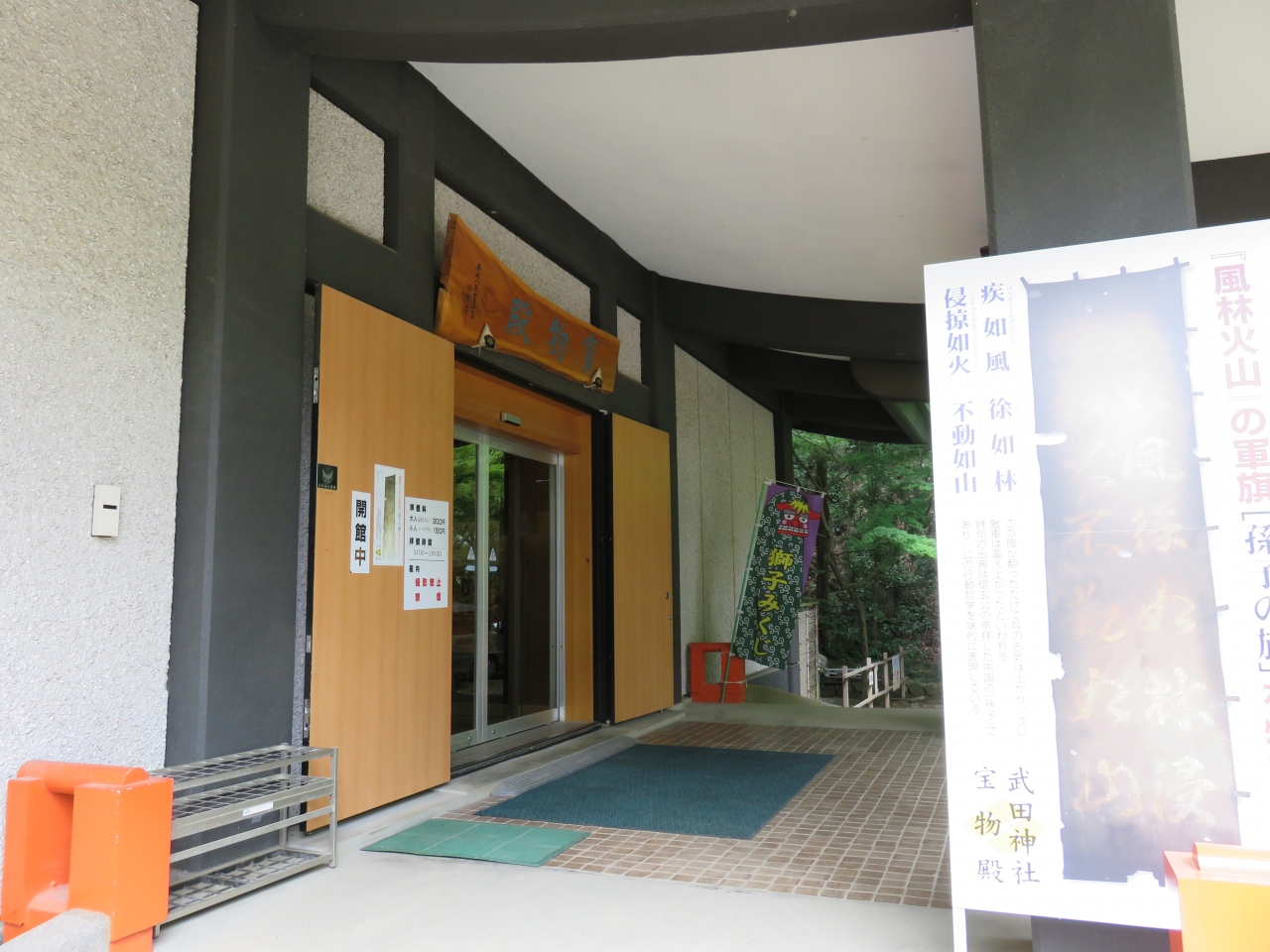 武田神社の中にある宝物殿です。そんなに見るものはないのですが、いわれは不明とありましたが、「風林火山」の旗があり、信玄公と孫子が一緒になった兵法を伝えるものとして、この私にも感動を与えます。