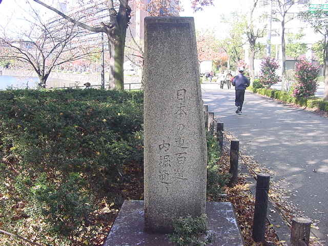 皇居の入口となるさまざまな門に面する通りが内堀通り。交通量の多い自動車道路とは別に、散策路もよく整備されていて、皇居周辺のジョギングを楽しむ人が多いです。日本の道百選に選定されていることを示す石碑が通り沿いにありました。