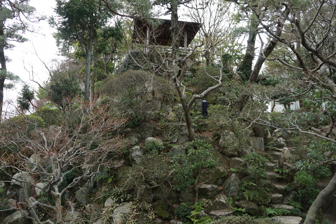 尚古荘は、昭和初期に地元の米穀商、岩崎明三郎が造った京風庭園。西尾城東の丸の遺構を生かした庭園で、築山はちょっとないくらいに険しい山。中心部の池をはるかに見下ろすような構造です。