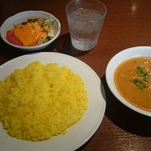 チキンカレーは味はややマイルドで甘めかな?大きめのチキンが2つ入っていましたがチキンは今一つでした