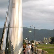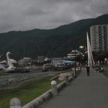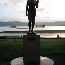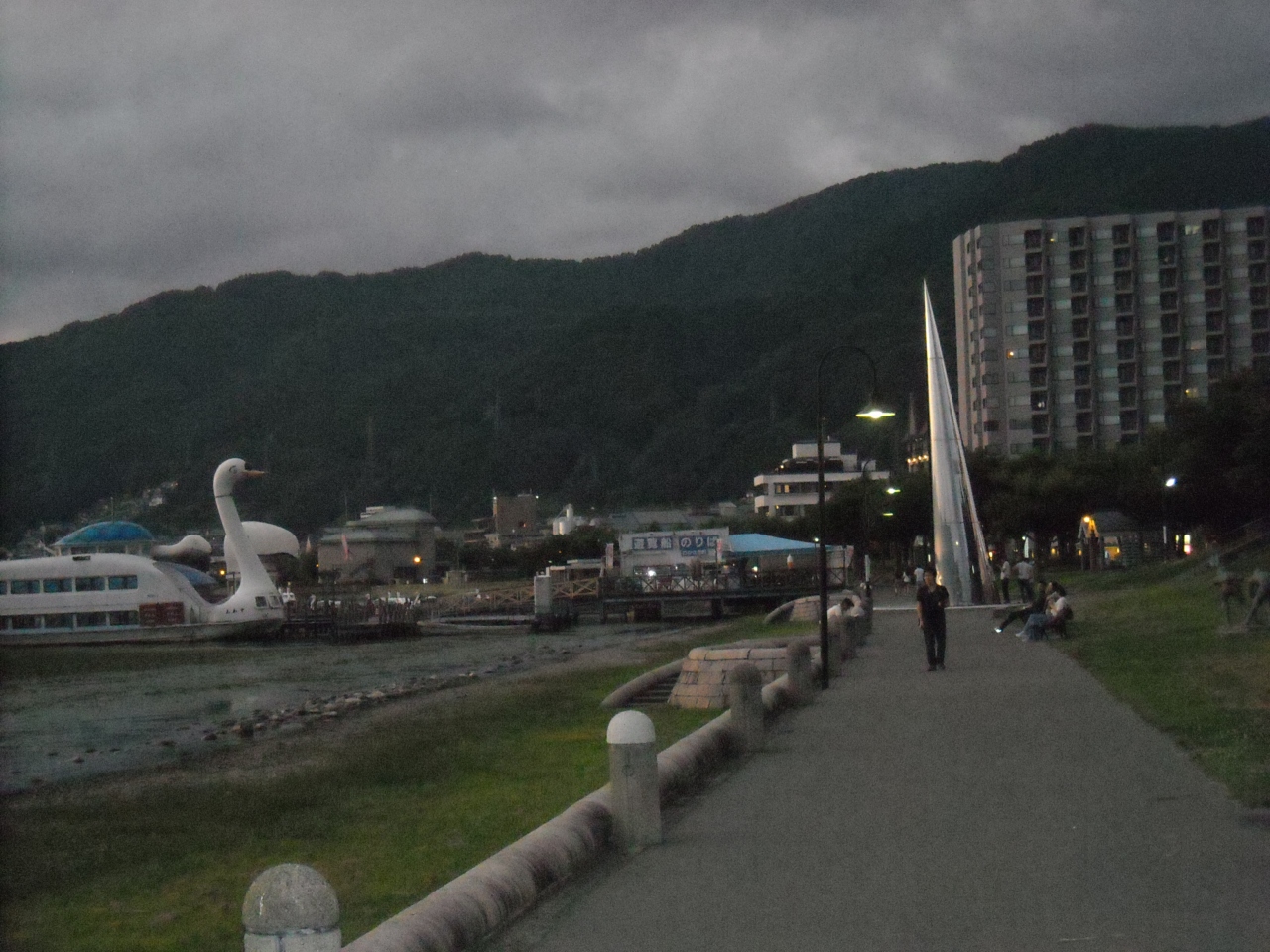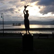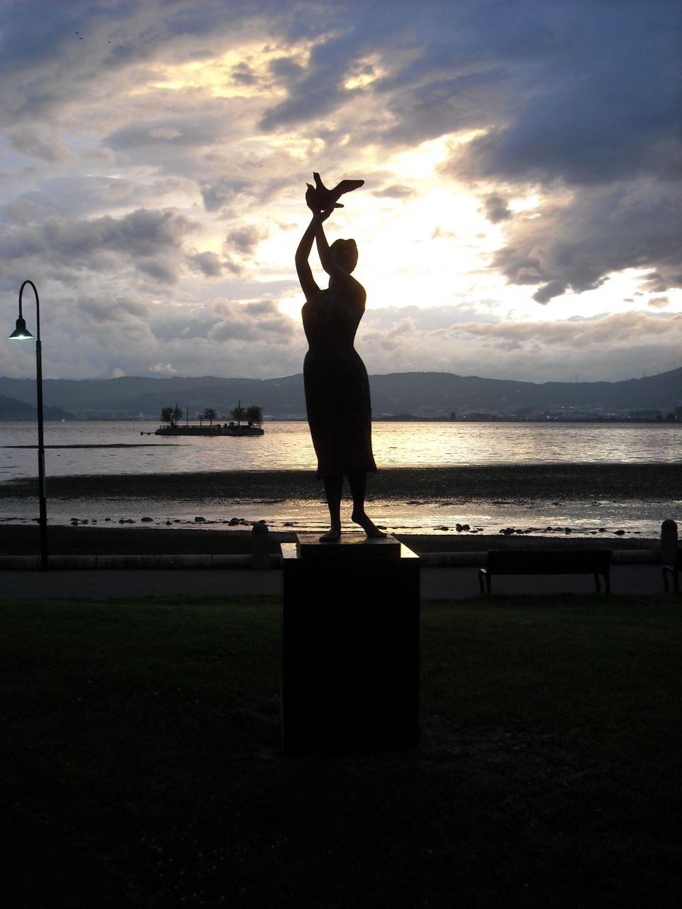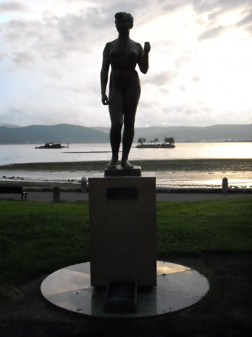 駐車場があり出たところが船着き場。あたりに人もなく何となくウロウロと散策、そして彫刻像が湖畔に幾つか立っていました、そこが公園であり(石彫公園) と呼ばれていることを後で知りました、近代的な建築物に囲まれてしまいましたが水辺には風情が残っているようでした。