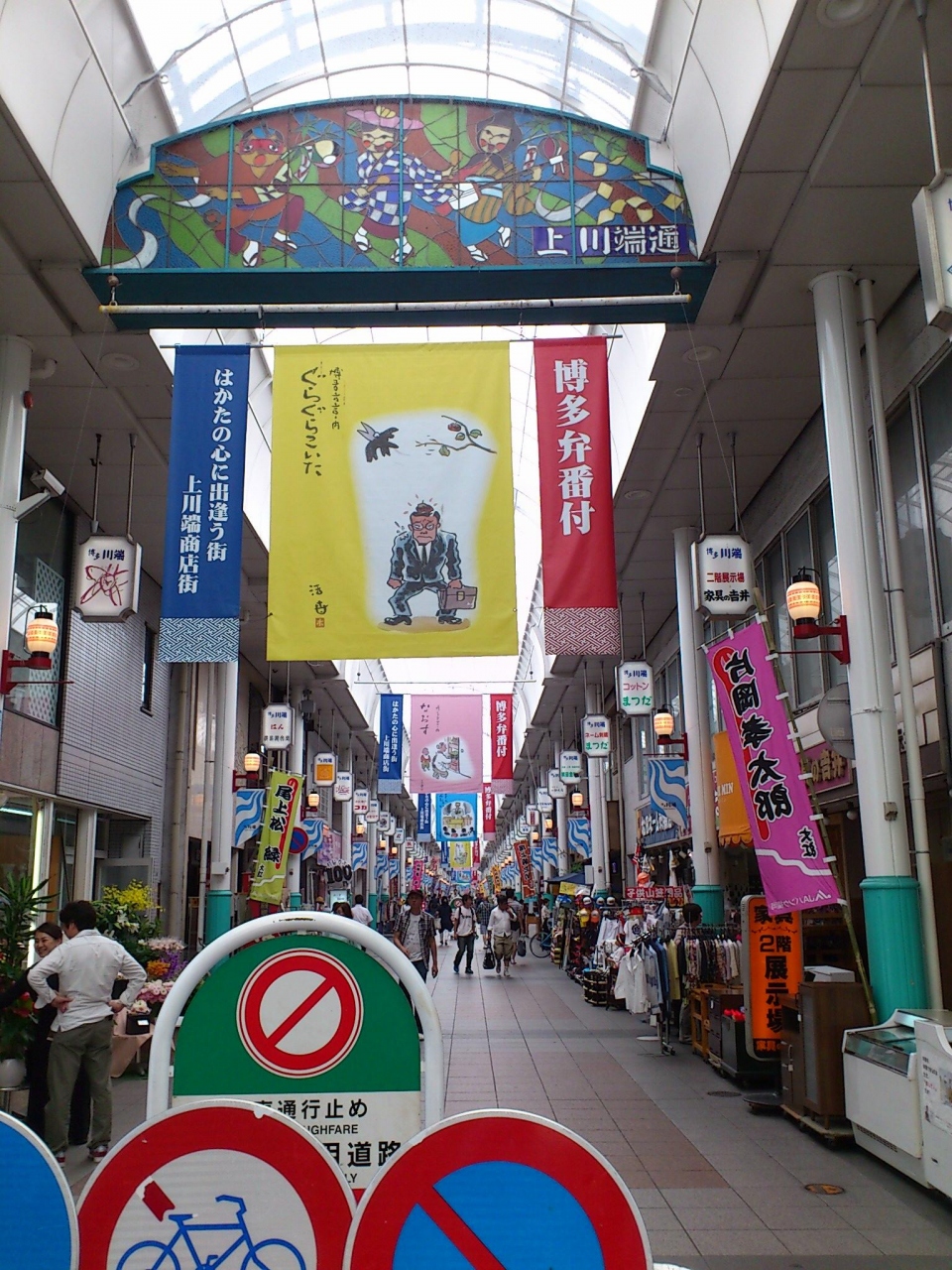 博多の櫛田神社から地下鉄の中州川端駅まで歩いて移動しました。中州川端駅の近くにこのアーケード式の上川端商店街がありました。入口にはオッペケペー節で有名な川上音二郎の銅像がありました。にぎやかな商店街で地下鉄に乗る前に、つい寄ってしまいました。