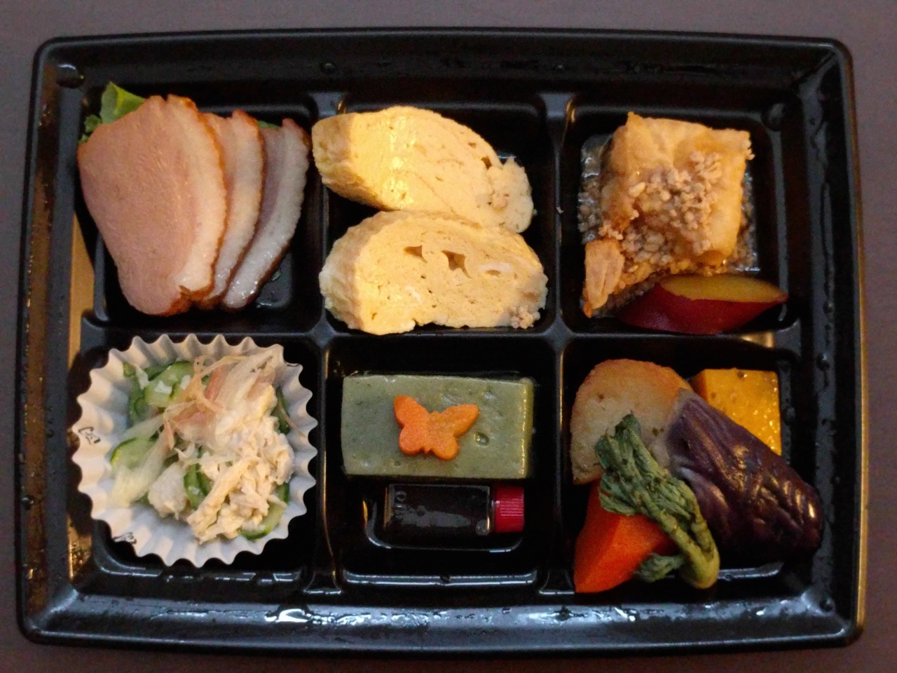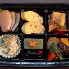 合鴨燻製や野菜わさび和え、湯葉とみょうが酢の物などが入って、美味しかったです。