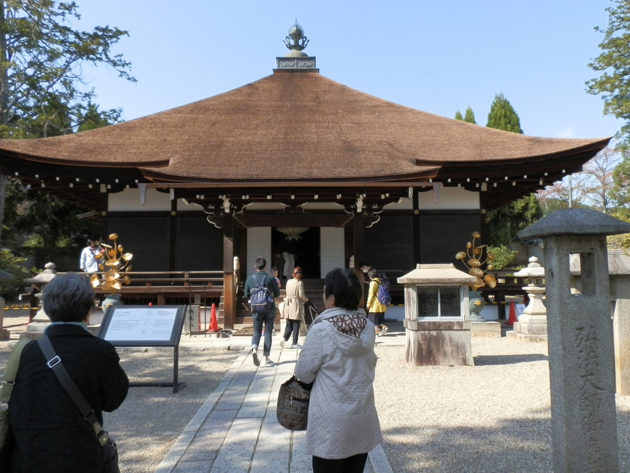仁和寺は満開の桜で飾られます。中門内の西側一帯に「御室桜」、金堂前の染井吉野、鐘楼前のしだれ桜などが競って咲き誇ります。御影堂にも多くの人が参拝に訪れていました。