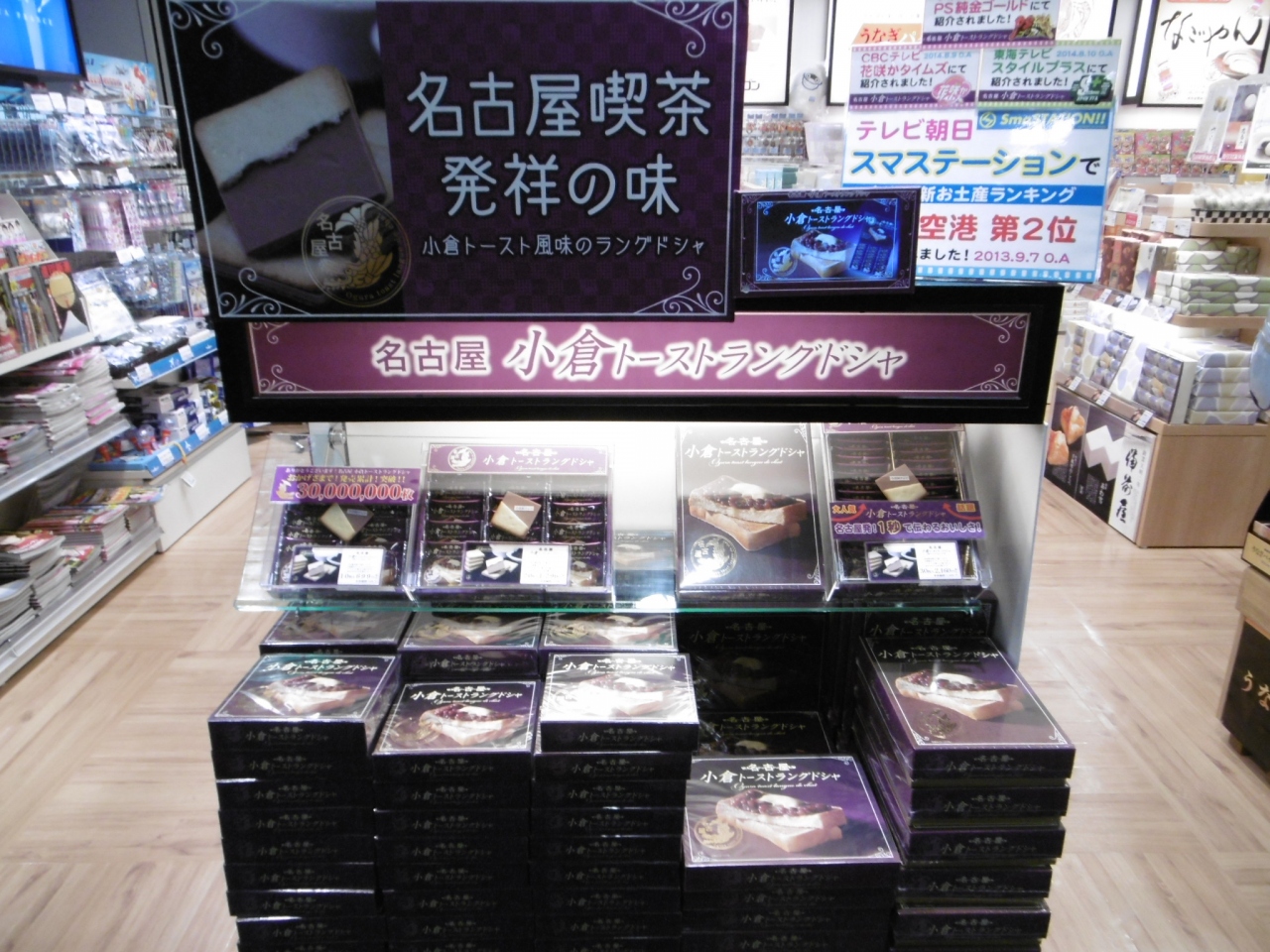 「ANAフェスタ 中部ゲート2号店」は保安検査場後にある。この中だとJALのブルースカイより面積が広く、商品数が多い。名古屋の茶店にある小倉トーストを菓子にした小倉トーストラングドシャが目立っていた。こりゃ名古屋土産になる。